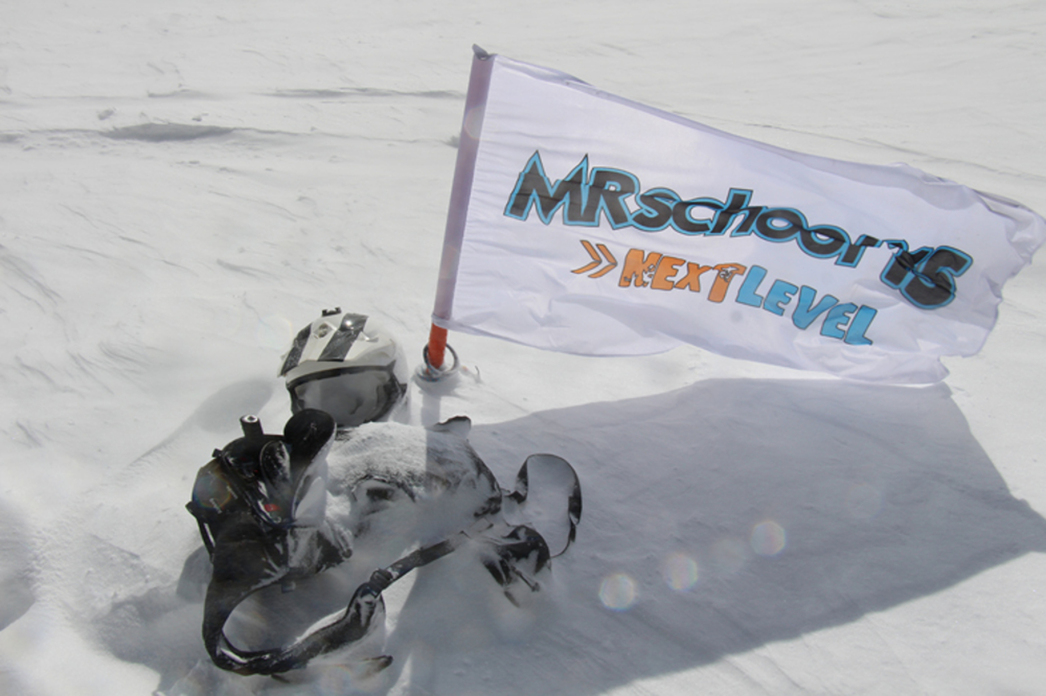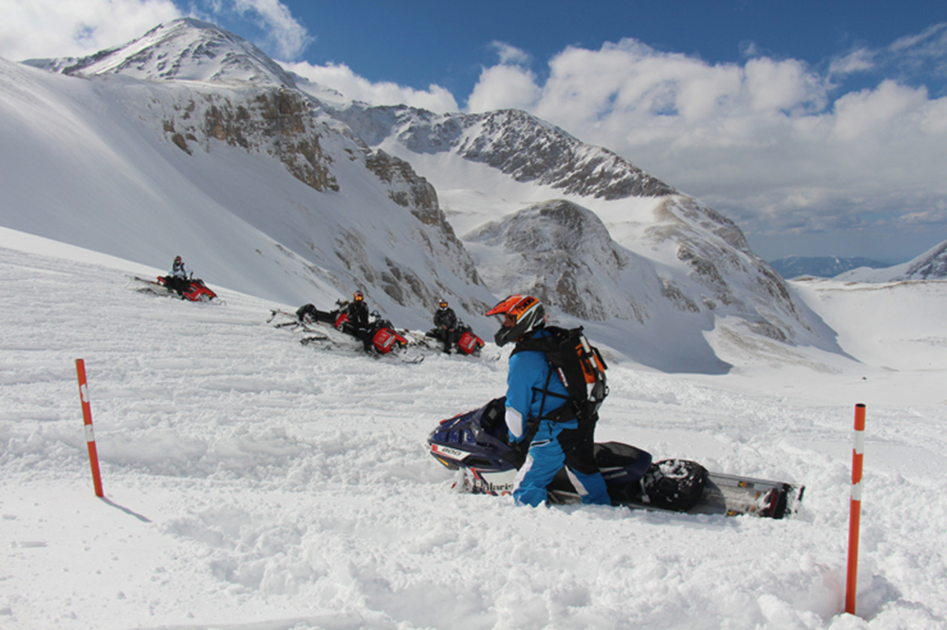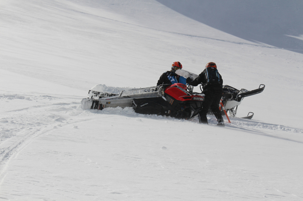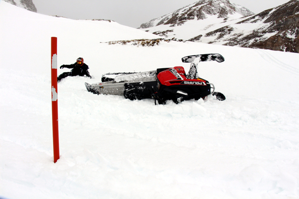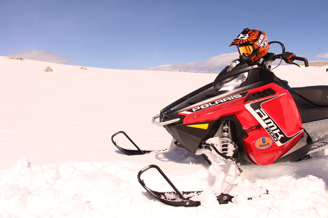 Практические занятия в школе Mountain Rider проходят на одних из лучших снегоходов в своем горном классе – Polaris RMK 600. Главные их достоинства: легкий вес, идеальная для горного катания развесовка и не слишком теплонагруженный мотор, который не перегревается даже при эксплуатации в плюсовую погоду. Практика начинается с отработки на равнине уже знакомых по подмосковью упражнений: постановка снежика на месте на одну лыжу, проезд змейки на одной лыже, разворот, парковка снехохода. С этой часть задания успешно все справилисью И тогда инструктор усложнил задание: едем к подножью горы Оштен, на склоне наш тренер выставляет вешки и показывает, что от нас требуется. Со стороны – все элементарно. Но как дело доходит до практики, понимаешь, что законы физики (а именно сила притяжения и вектора направленности сил) берут над тобой верх.