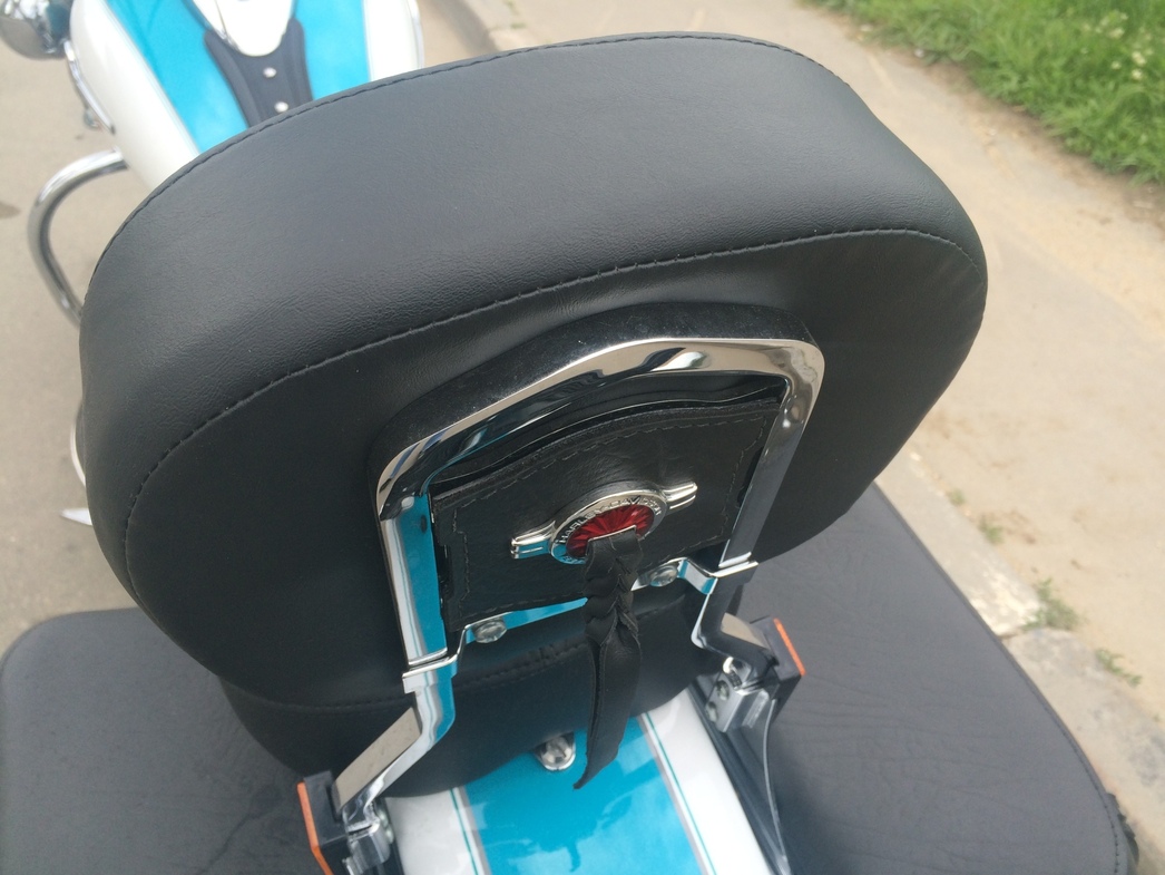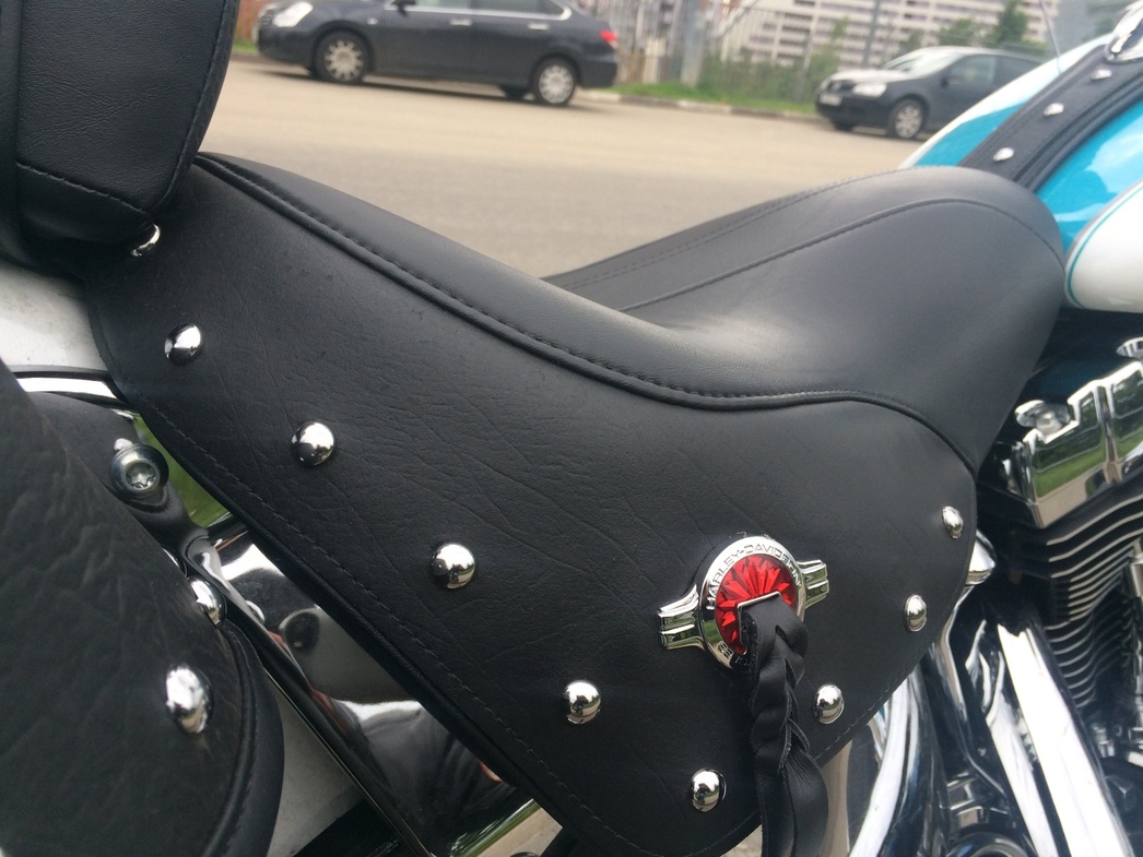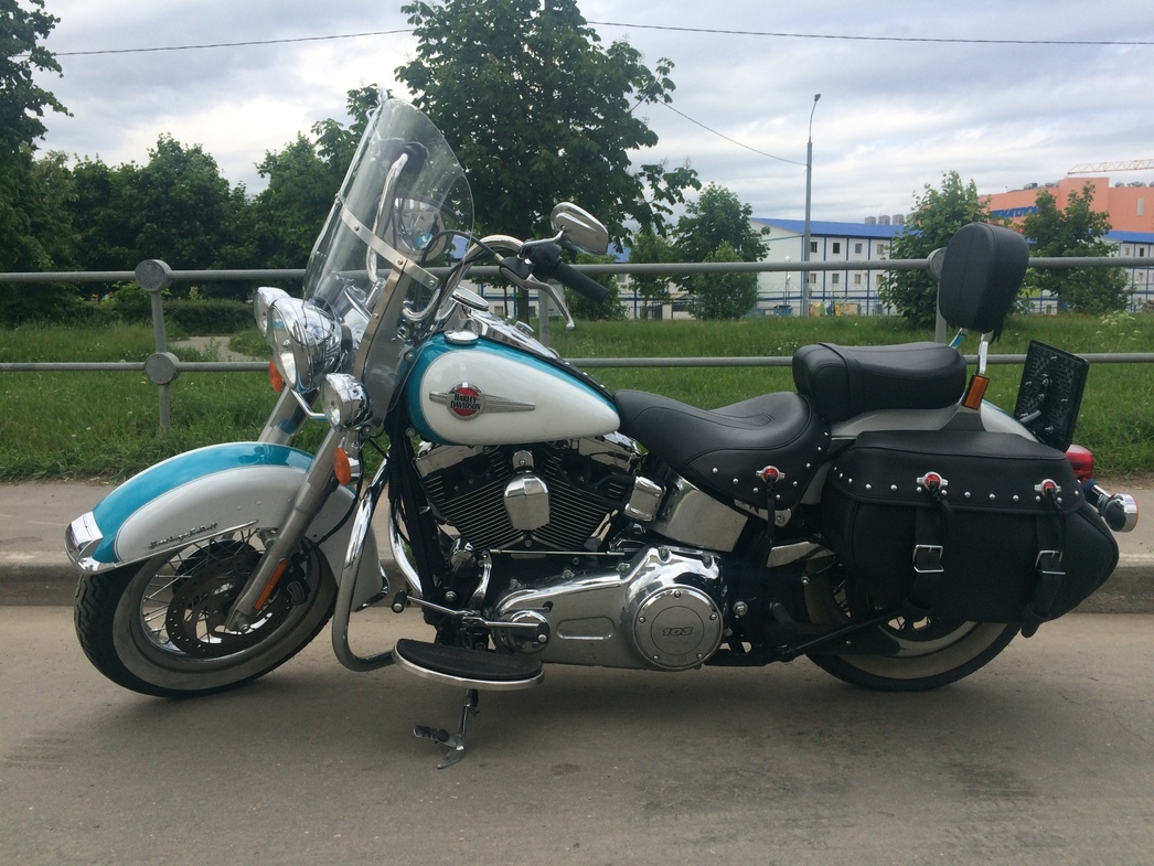 Это довольно крупный мотоцикл с массивными крыльями и удобными сиденьями. В нашем случае не него были дополнительно установлены большие кожаные боковые кофры, очень вместительные, как показала последующая эксплуатация. Седло отделано кожей в стиле кофров, удобная спинка для пассажира. От ветра, осадков и прочих насекомых защищает большое ветровое стекло, которое можно регулировать по высоте, пусть и в небольшом диапазоне, а ноги удобно располагаются на широких платформах. Посадка при этом получается абсолютно прямая, с вытянутыми руками – в таком положении можно совершать длительные марш-броски сквозь континенты. Собственно говоря, Heritage и создан для дальних поездок, просто в отличие от исполинских туринговых мотоциклов компании, этот байк еще и выглядит мегастильно. Спицевые колесные диски обрамляют покрышки с белыми флипперами, обилие хрома слепит глаза, звук выхлопа не то чтобы очень громкий, зато настоящий — мясистый и породистый.