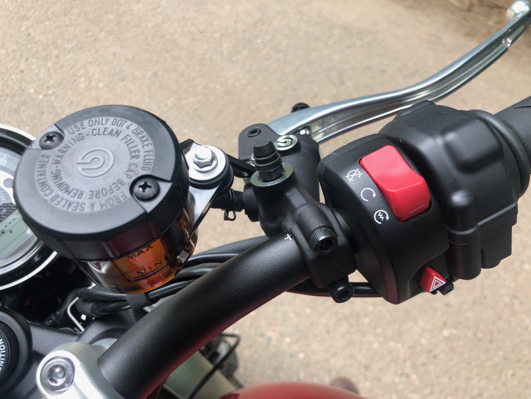 Круглые зеркала заднего вида стильно расположены на торцах руля и, помимо своей непосредственной функции, еще и определяют габариты мотоцикла — если между машин пролезли зеркала, то уж точно пройдет и весь мотик, ведь у Speed Twin больше нет никаких выступающих частей.