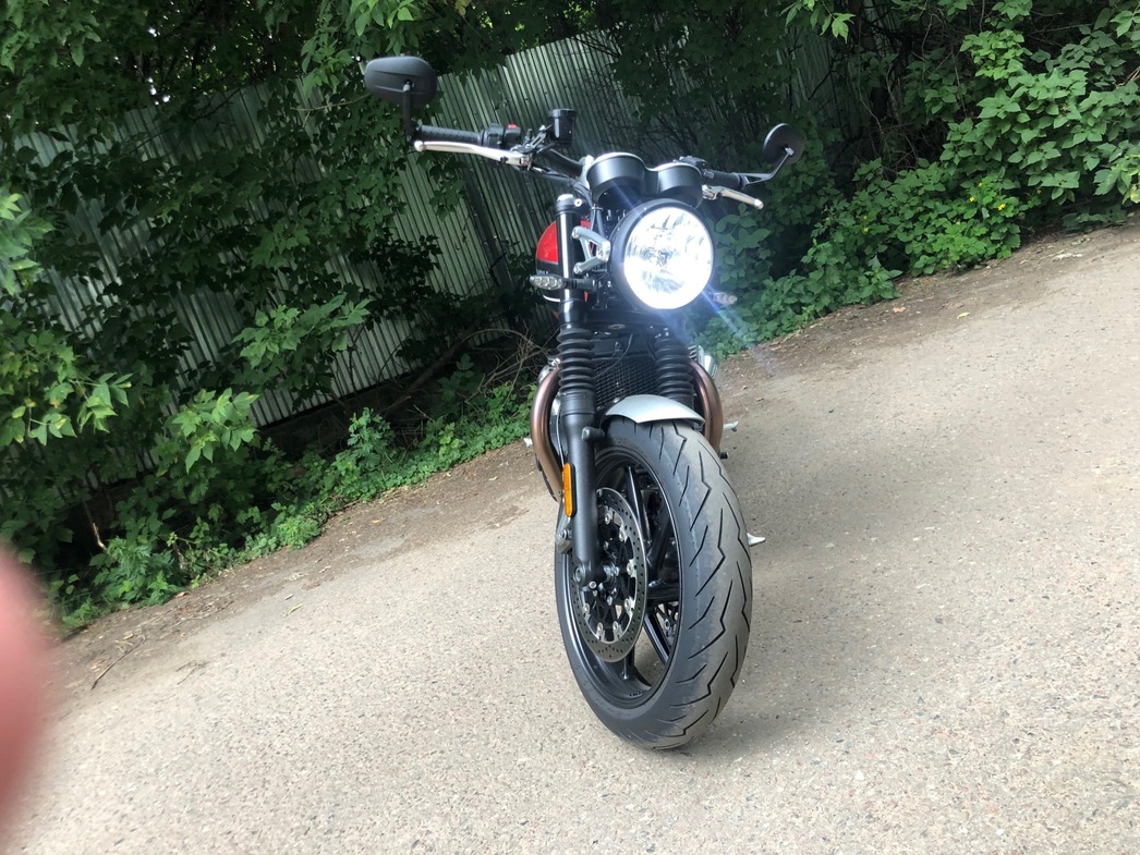 Оригинальная модель родстера Speed Twin увидела свет еще в 1938 году и уже тогда могла похвастать весьма неплохой для своего времени динамикой. Новый же мотоцикл — вообще ураган по меркам класса, стоит лишь посерьезнее выкрутить ручку газа, как байк так и норовит встать на дыбы и вырваться из под седока. Все-таки, табун из сотни лошадей — это далеко не детские шутки.