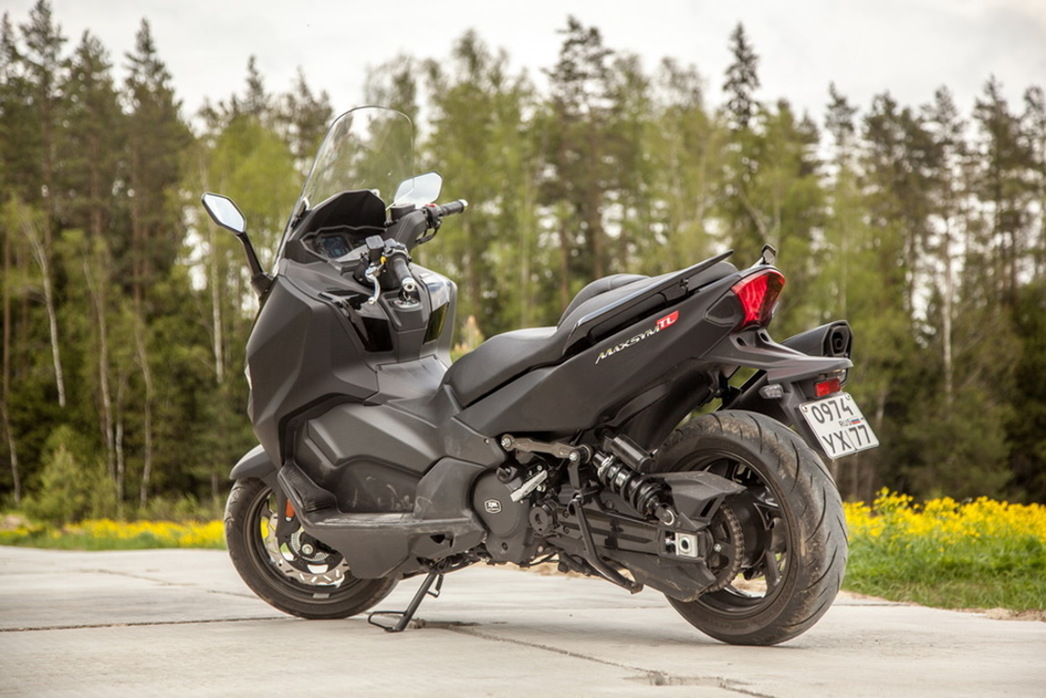 И при маневрировании в городском потоке, и на загородных извилистых дорожках TL 500 показал себя надежным и послушным в управлении. Под сброс газа он, слегка потупившись, охотно кренится на бок, и легко пускается по дуге. При этом 15-дюймовые покрышки довольно цепко держатся за покрытие, позволяя кренить скутер почти до касания пластиком асфальта.
