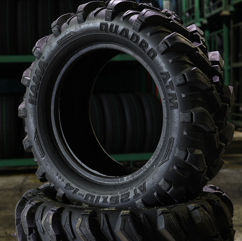 Направленный рисунок протектора с усиленными блоками обеспечивает комфортное вождение как по грунтовым дорогам, так и отличную тягу при езде по бездорожью. А специально разработанная резиновая смесь протектора имеет повышенные прочностные характеристики. Иначе говоря, шина пригодна не только для туристических поездок загород, но и запросто может использоваться в более экстремальных условиях, например, в скалистой местности. Еще одно неоспоримое преимущество QUADRO ATM — широкий температурный диапазон использования от −45 до +55 °C. Более того, специально для зимы шины KAMA могут быть ошипованы (на рабочей стороне протектора есть метки для установки железных «когтей») — если вдруг у владельца квадроцикла появится желание участвовать в зимних скоростных заездах.