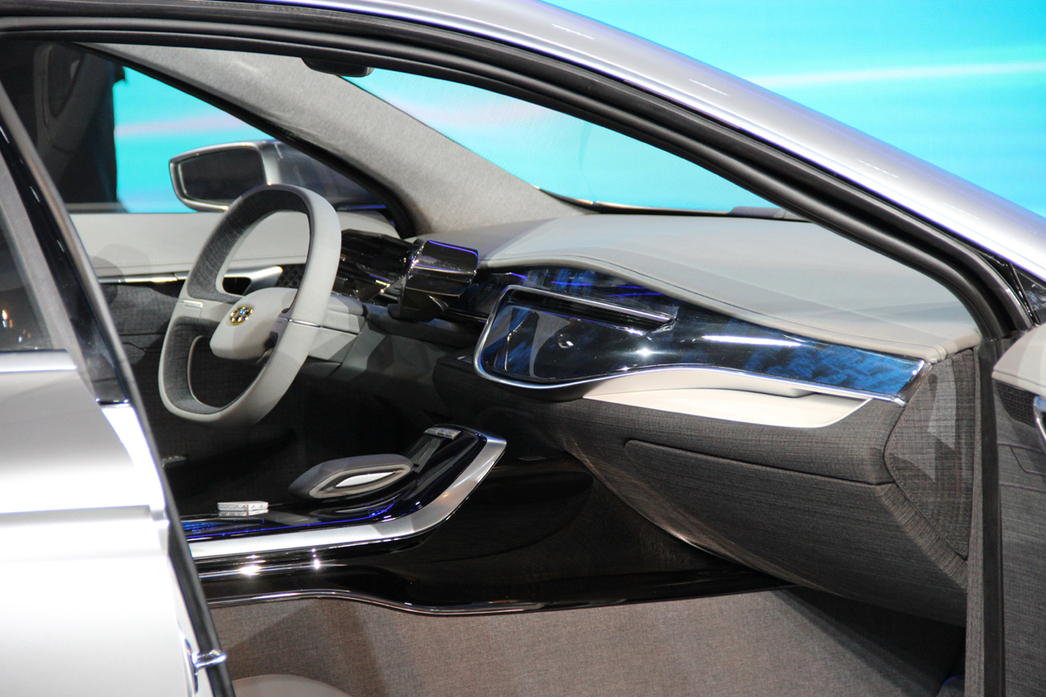 Интерьер предсерийного концепта пока еще сохранил ряд футуристических деталей шоу-кара: анимированная центральная консоль, растянутое почти на всю ширину торпедо и меняющая цвет в зависимости от выбранного водителем режима настроек: Eco, City или Sport.