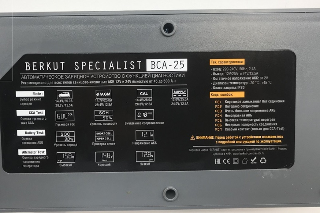 В числе важных особенностей, принципиально выделяющих данную новинку на фоне других, в том числе и импортных аналогов, являются развитые функции тестирования батарей, а также параметров генератора. Благодаря им BСА-25 в автоматическом режиме выполняет полноценную оценку состояния автомобильного АКБ любого типа с определением степени ее заряженности, внутреннего сопротивления и максимального пускового тока (ССА).