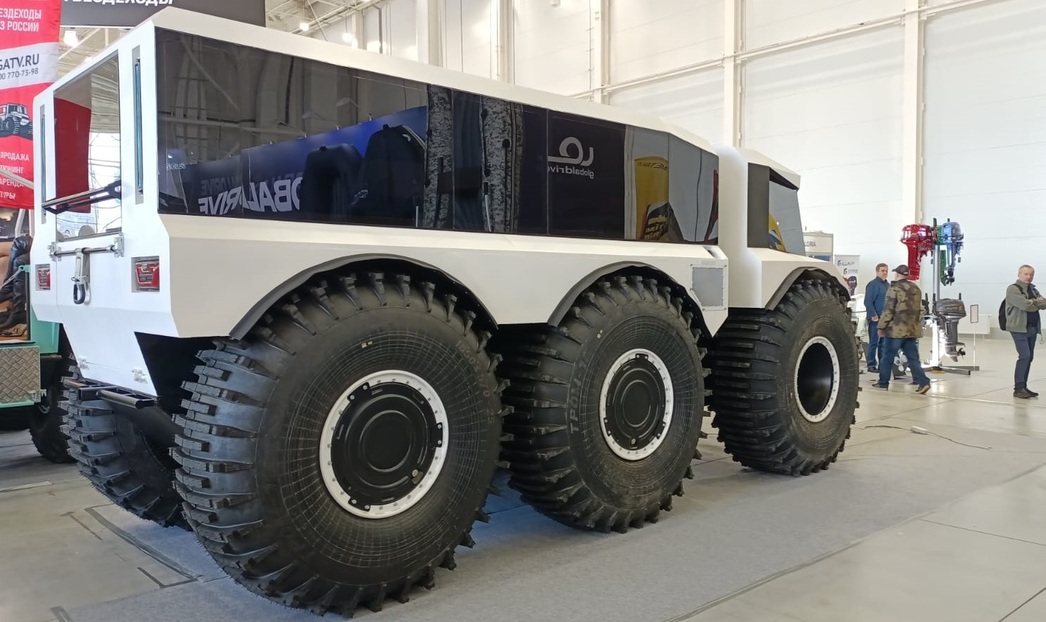 Среди этой техники настоящим монстром смотрелся новый снегоболотоход «Макс Электро» (Калуга). Модель отличает более высокая проходимость, обеспечиваемая шестью ведущими колесами, а также мощным трехкоординатным узлом сцепки. Такой электровездеход, батарея которого рассчитана на пять часов езды по бездорожью, способен перевозить до 12 человек или не менее тонны груза.
