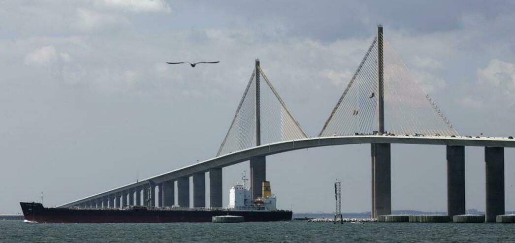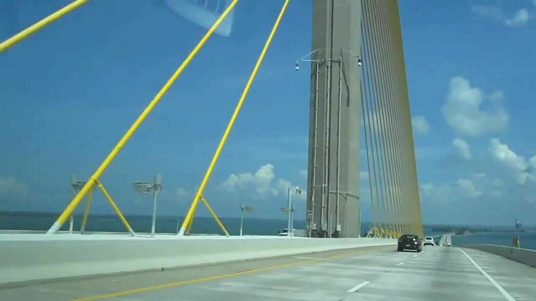 Трасса катится вниз к Мексиканскому заливу. Вот первый мост через широкую реку Менати, потом большая развязка, по которой переезжаю на 275-й хайвей и, наконец, раскрывается под голубым куполом неба бирюзовая ширь залива Тампа, которую перечеркивает огромной дугой автомобильный мост Sunshine Skyway Bridge.