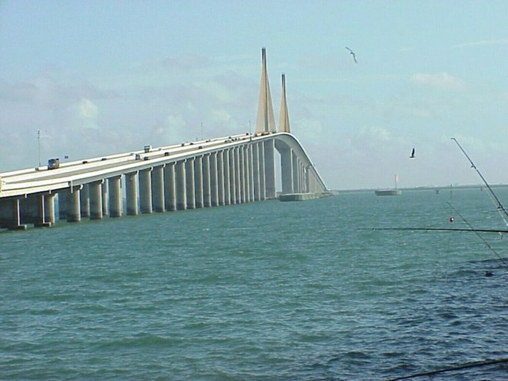Название этого полета инженерной мысли переводится как «мост солнечной эстакады»). Он и в самом деле редкий красавец: начинается поднятыми над волнами метров на десять двумя эстакадами, протянувшимися с двух берегов залива. К середине перехода они весьма круто дыбятся вверх, в гору, где над самой середииой залива вознеслись вантовые пилоны главного пролета: полет инженерной мысли из стали и бетона! Длина этого изящного сооружения – 6,6 км, ширина – 29 м (по две полосы в обе стороны), высота всей конструкции – 131 м, высота свода моста, под котрым и проходят морские суда – 53 м! Строился он пять лет, введен в эксплуатацию в 1987 году, обошелся казне в $244 млн. Стальные тросы-кабели заключены в 84 трубы-ванты диаметром в 9 дюймов (22,86 см), именно они и поддерживают главный «висячий» пролет. «Traval Chanal» занес это «солнечный» мост в список десяти лучших в мире под третьим номером.