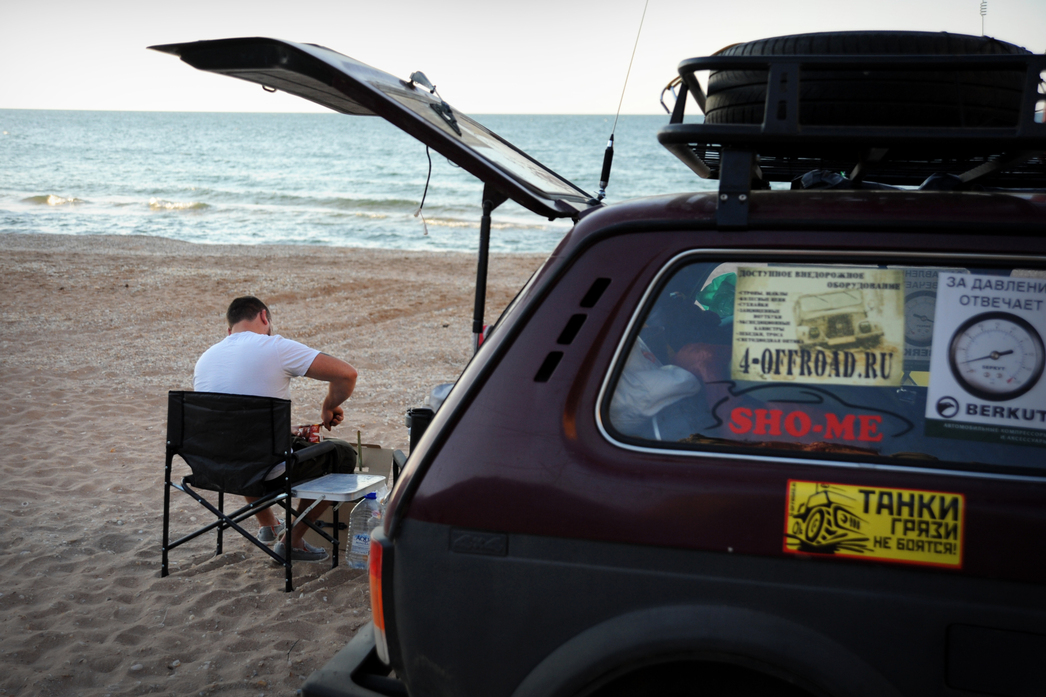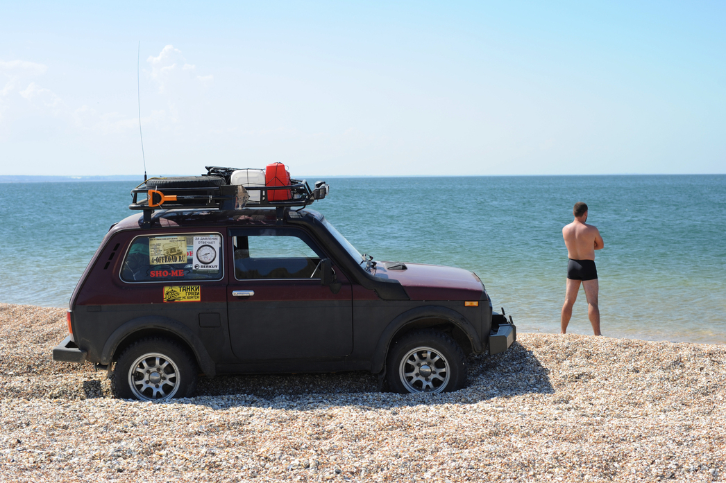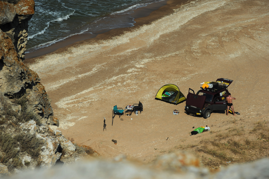 Забегая вперед скажу, что позже мы преодолели этот участок без проблем, все-таки «Нива», как правило, без эксцессов проходит там, где застревают ее старшие товарищи по цеху. Песчаный пляж, перемежаемый полосами ракушечника, и прозрачное голубое море — место настолько живописное, что нам не верилось в реальность происходящего. На скорую руку мы поставили палатку и легли спать после дальней дороги.