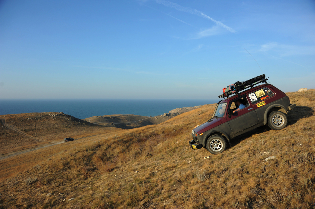 Съехав с парома в Керчи (с какими «засадами» мы встретились, добираясь сюда по трассе «Дон», вы можете узнать здесь) намечаем маршрут. И первым номером в списке — посещение так называемых Генеральских пляжей: оторванного от благ цивилизации местечка на азовском побережье. Тут надо заметить, что северный берег Крыма — раздолье для тех, кто предпочитает отдыхать в одиночестве и при этом передвигается на полноприводном автомобиле. Итак, ранним солнечным утром, выгрузившись с парома, попадаем на довольно разбитую дорогу из порта в город. Проскочив Керчь насквозь, мы в Багерово, доверяясь навигатору, свернули в поля. Степи на север от города пронизаны целой сетью грунтовых дорог, соединяющих уже не существующие села и поселки, заброшенные карьеры и каменоломни, а также уже давно не функционирующий военный аэродром и прилегающий к нему полигон. Под колеса нашей «Нивы» легла крымская степь, сзади взвился густой столб пыли.