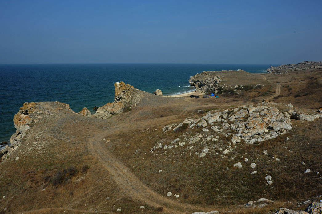 Через полчаса выезжаем на довольно прямую и накатанную грунтовку, которую навигатор поименовал «рокадой». Это дорога должна в случае чего обеспечивать передвижение войск и подвоз припасов к частям. Армейских подразделений мы, конечно, не нашли, хотя время от времени вдалеке мелькали пограничники с собаками. Свернув с рокады в сторону моря и преодолев довольно крутой подъем, увидели перед собой водную гладь до горизонта. Так что дело осталось за малым — найти место, где поставить палатку.