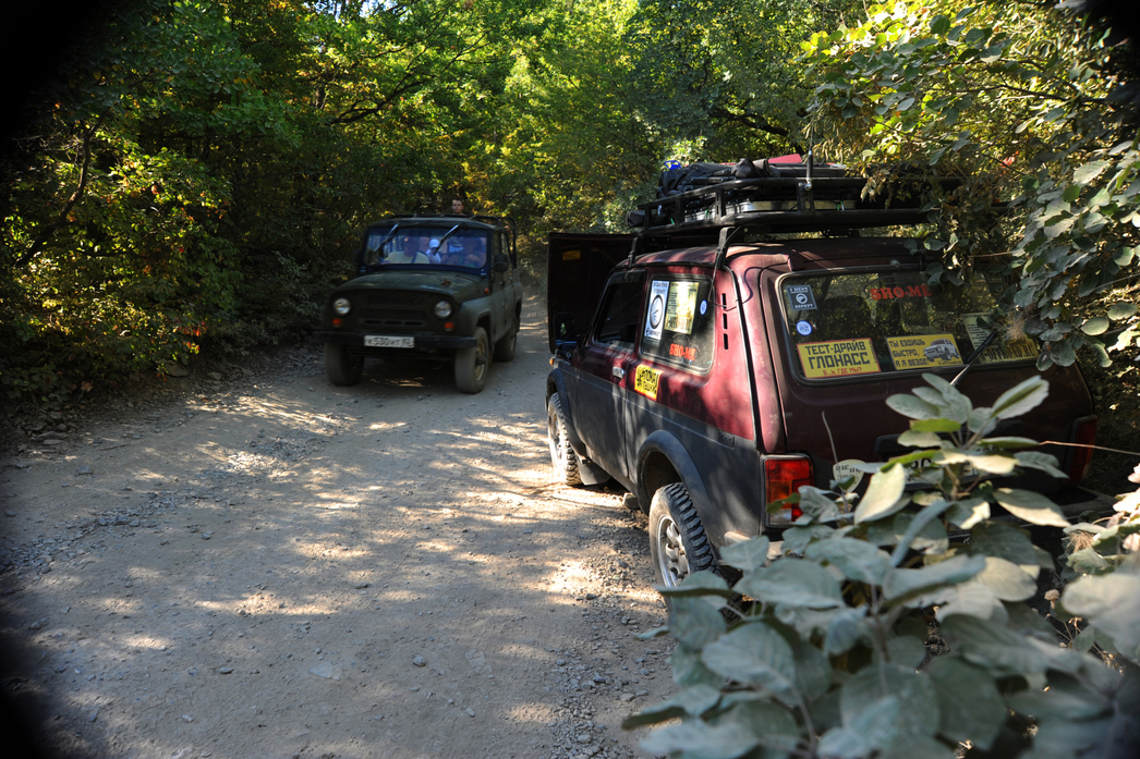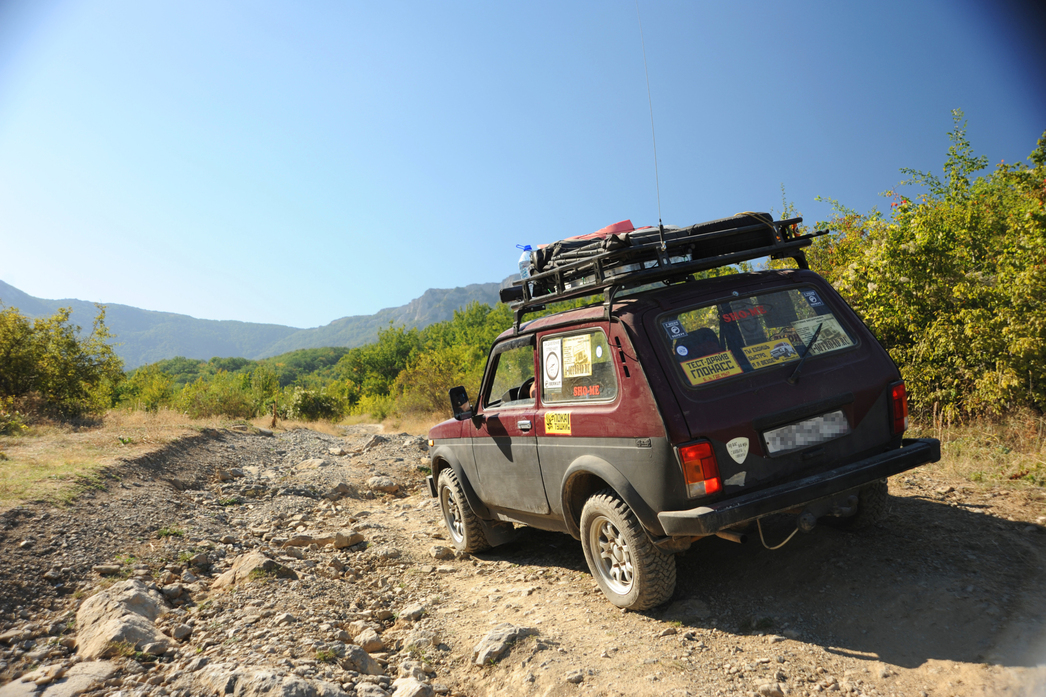 Доехав до Судака, ввинчиваемся в извилистый серпантин по направлению к Алуште (этот серпантин, кстати сказать, по ощущениям гораздо экстремальней дороги в Сочи, защитного ограждения местами нет, да и покрытие немного хуже). В Солнечногорском сворачиваем направо и устремляемся в горы по вполне приличной асфальтированной дороге. То, что мы едем в нужном направлении, подтверждают проносящиеся мимо лифтованные УАЗы с радостно поглядывающими по сторонам туристами. На въезде в село Генеральское нас настойчиво уговаривают не ехать дальше и пересесть на UAZ — естественно, не бесплатно.