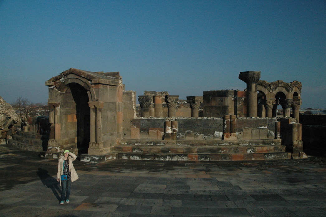 В отличии от трассы, в Ереване асфальт вполне приличный, да и сам город выглядит очень здорово. Площадь республики, архитектурный комплекс Каскад, и главное — гору Арарат с одноименным заводом коньяков осматривали из окна машины, а вот руины храма середины 600-х годов нашей эры заинтересовали куда сильнее. Казалось, что навигатор упорно не хотел вести нас к цели, но, повинуясь ему, мы все же просочились через покосившиеся ржавые ворота и, упершись в стадо коз, увидели неподалеку свою цель. Из ниоткуда тут же материализовался человек, сообщивший, что ездить тут нельзя и вообще сегодня выходной, но за три тысячи драхм (примерно 300 рублей) с носа, мы, оставив машину здесь, можем все посмотреть.