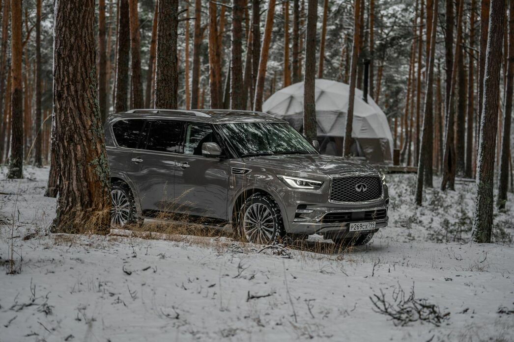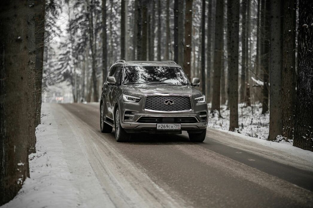 По заметенным снегом проселку «здоровяк» гребет, словно бульдозер. Не страшны ему ни сугробы, ни ямы с барханами. А уж по асфальту Infiniti QX80 едет, как локомотив по рельсам. Могучий V8, выдающий 405 сил мощности, ускоряет огромный внедорожник, будто ракета. Правда, и аппетит у «японца» — будь здоров! Меньше 17 литров на сотню он поедать не умеет. Впрочем, надо же как-то тащить на себе три тонны веса, не спасовав при этом ни на старте, ни на обгонах, ни на «бездороге». А прелестью покрытий российские направления, увы, не блещут. Особенно в окрестностях тех мест, куда мы едем…