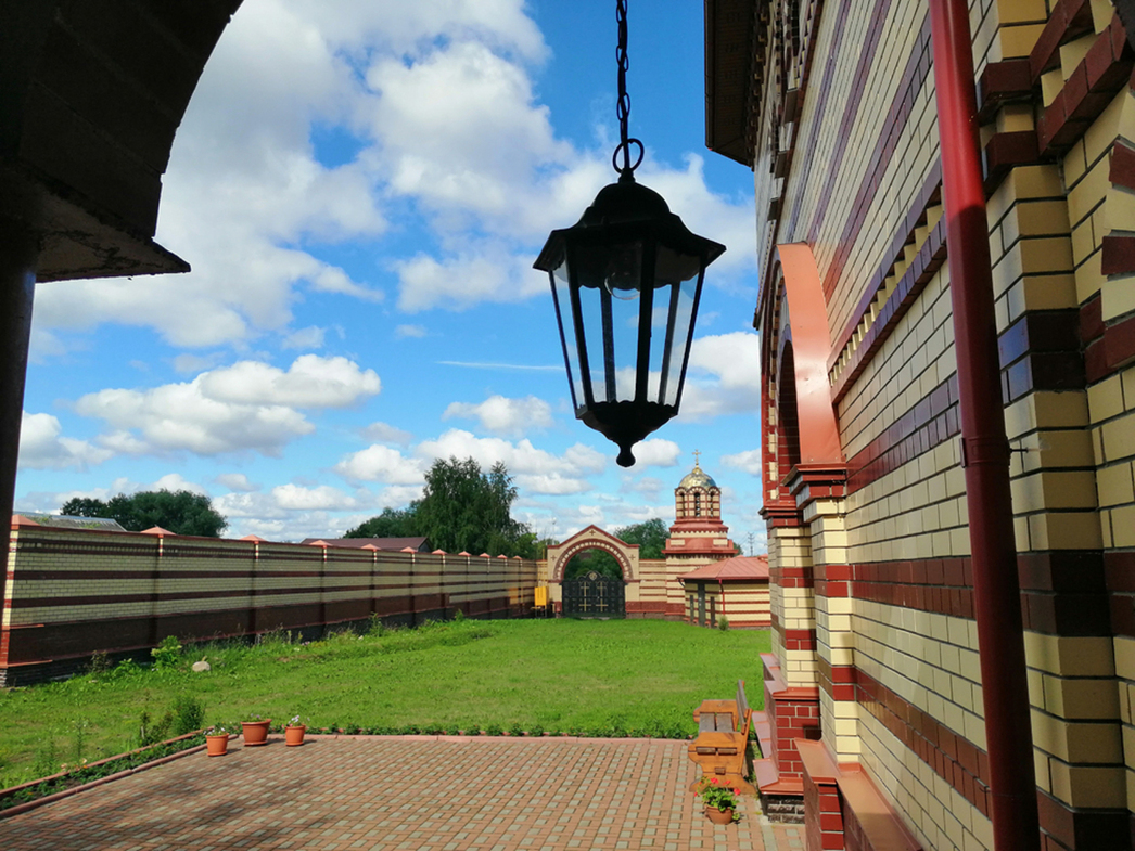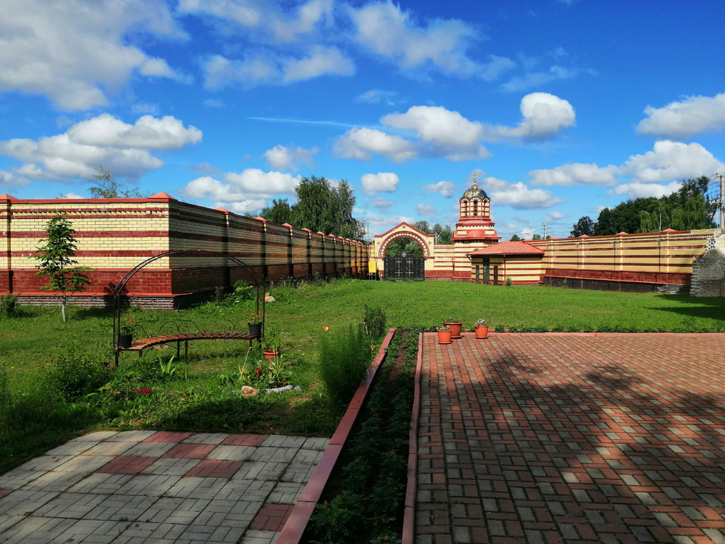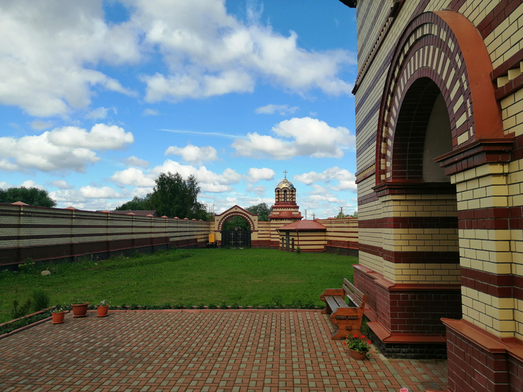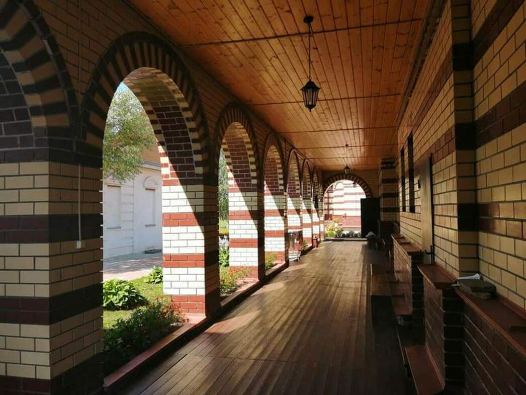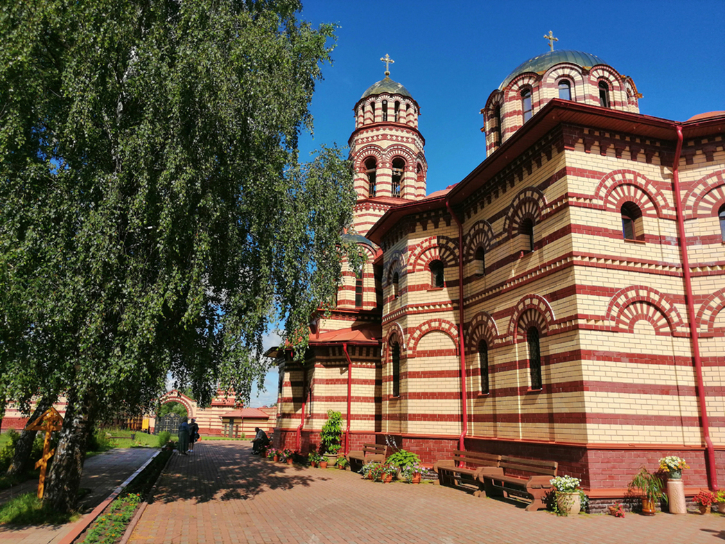 Даже в ненастную погоду здесь появляется ощущение солнечного света от пестрых желто-бордовых стен, арочной галереи и золоченных куполов. Секрет кроется в контрастном орнаменте фасадов, имитирующим древнегреческую плинфу (обожженную плитку). В стенах этого монастыря о Греции напоминает все, кроме природного ландшафта: вместо пальм здесь родные березки да сосенки.