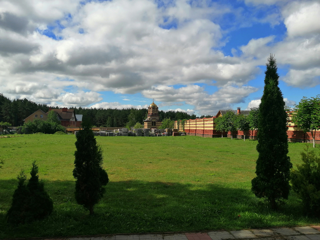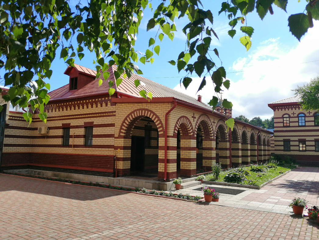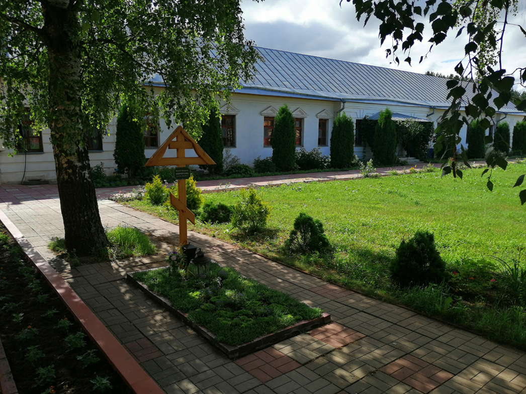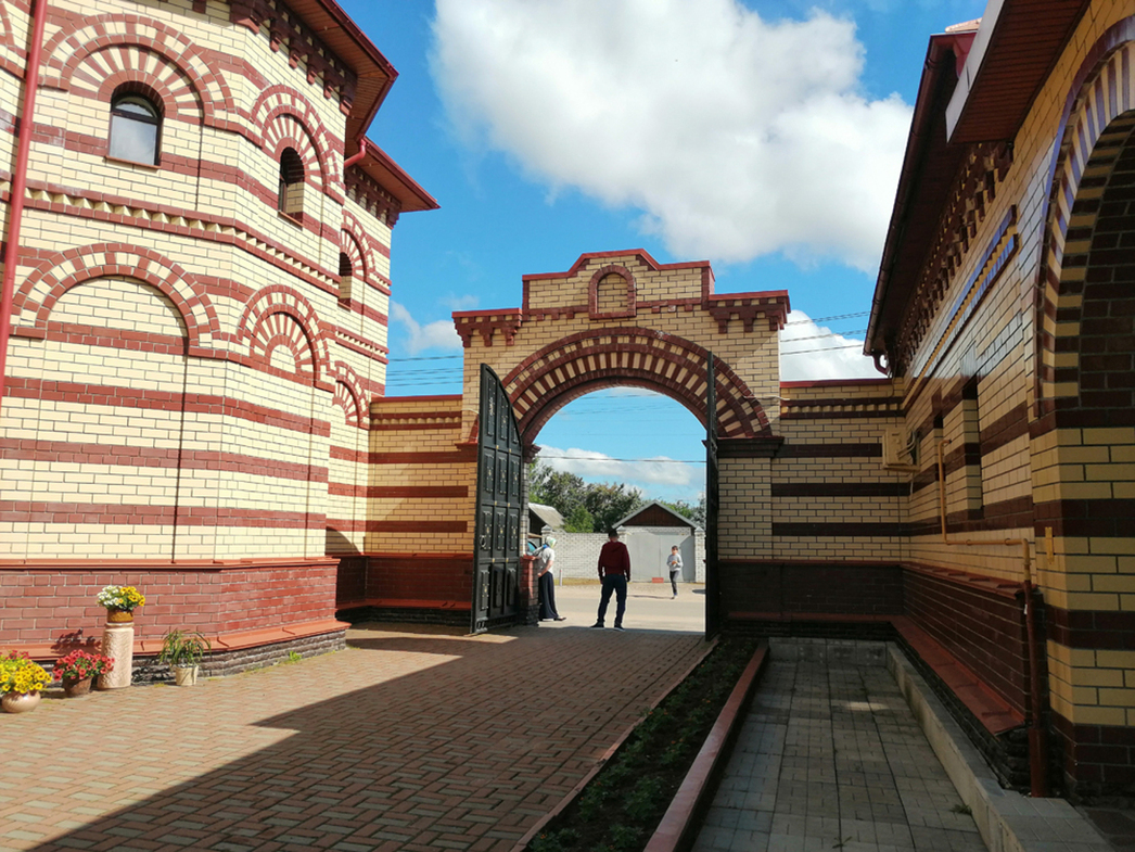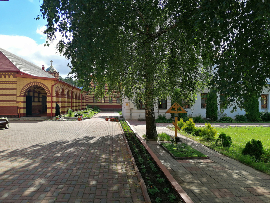 Даже в ненастную погоду здесь появляется ощущение солнечного света от пестрых желто-бордовых стен, арочной галереи и золоченных куполов. Секрет кроется в контрастном орнаменте фасадов, имитирующим древнегреческую плинфу (обожженную плитку). В стенах этого монастыря о Греции напоминает все, кроме природного ландшафта: вместо пальм здесь родные березки да сосенки.