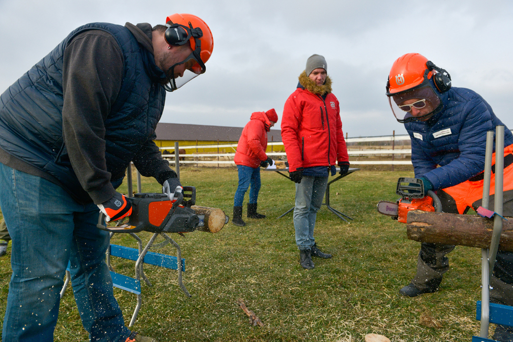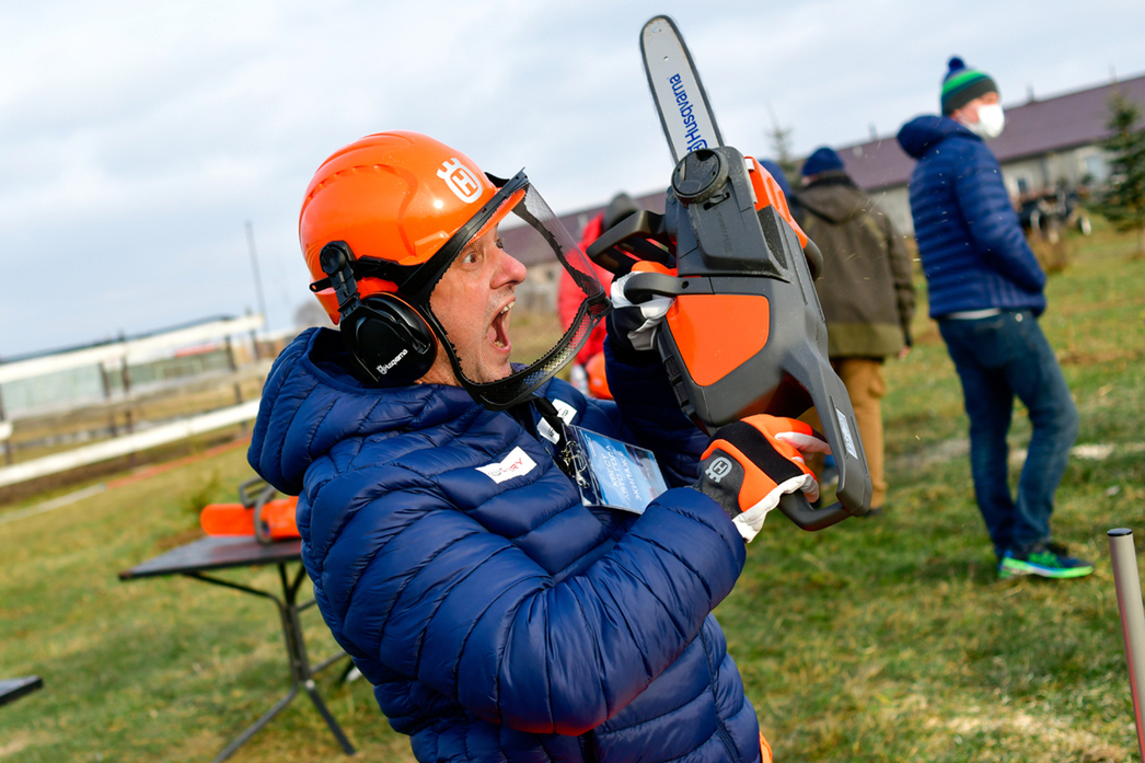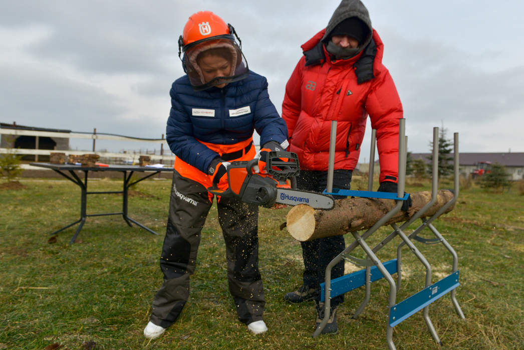И был уж совсем не автомобильный конкурс с аккумуляторными цепными пилами Husqvarna: требовалось на глазок отпилить от бревна три «блинчика» толщиной 26,5 мм.