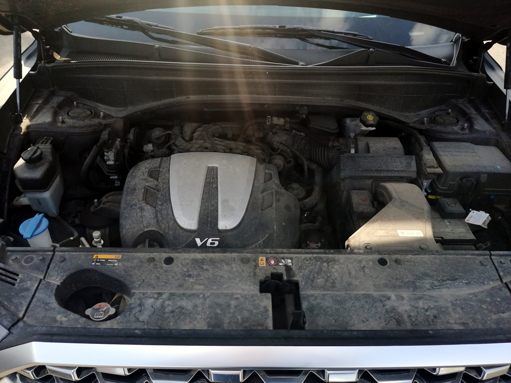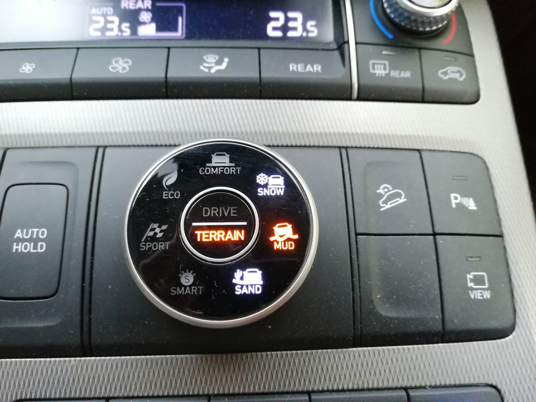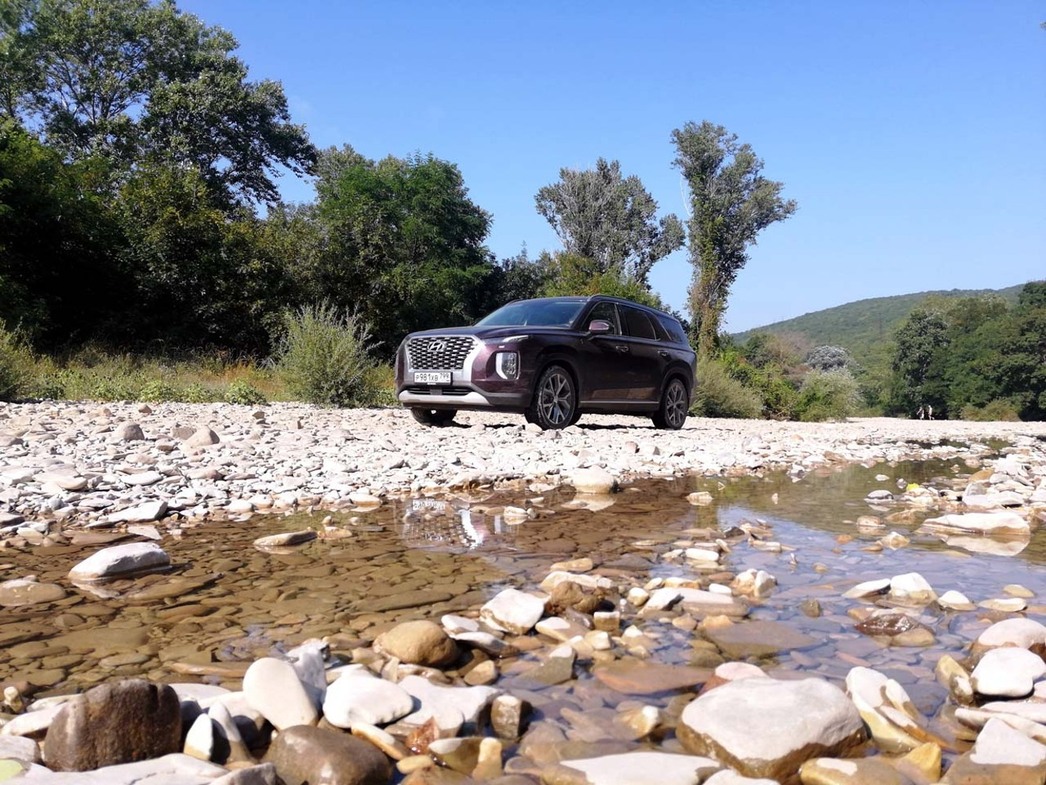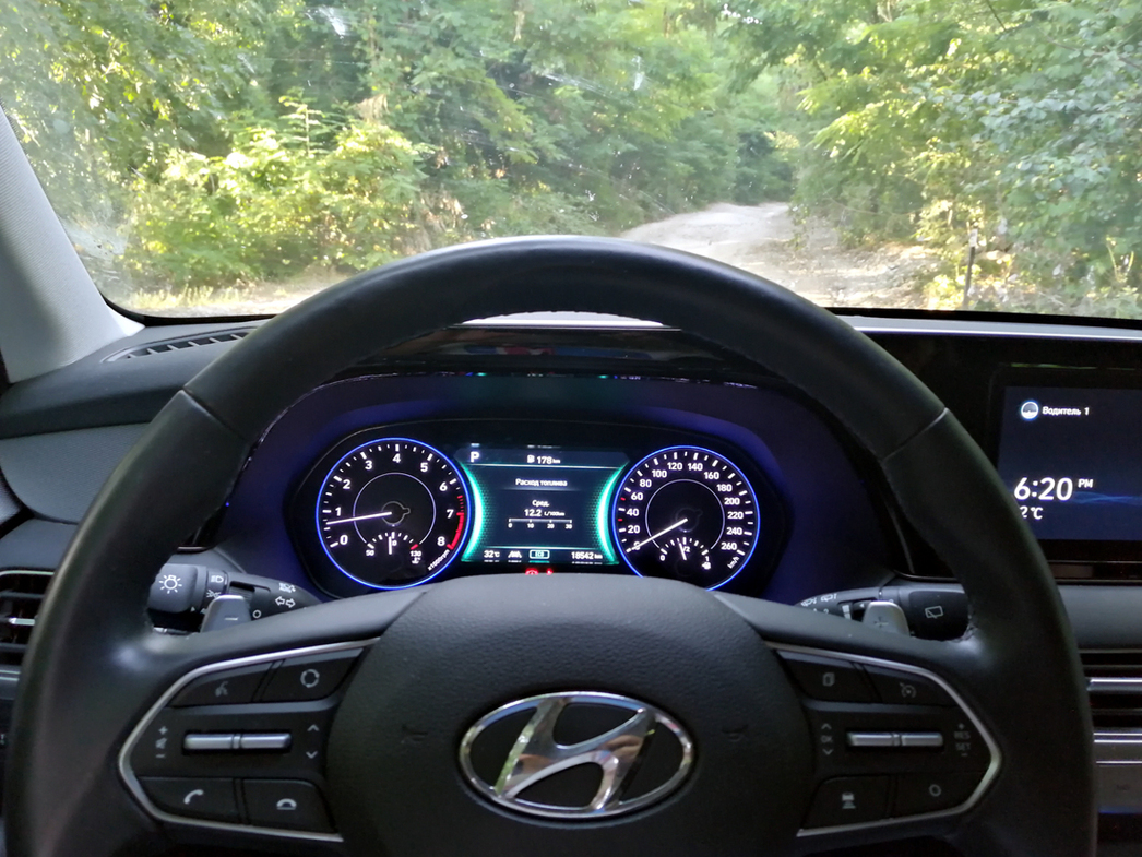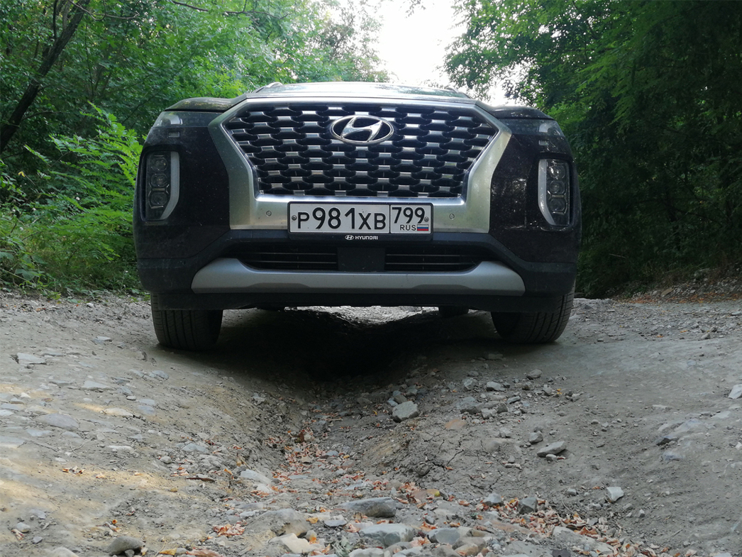Под капотом нашего Palisade прячется 6-цилиндровый атмосферный V-образник, объемом 3,5 литра, и мощностью 249 «лошадей». При движении по трассе к мотору не было замечаний: ни по мощности, ни по динамике разгона, ни даже по расходу топлива. За пределами асфальта, понятное дело, расход будет выше, да и динамика разгона здесь уже не имеет никакой ценности. На первый план — особенно в горах — выходит крутящий момент. Что ж, бензиновых 336 Нм «Палисаду» хватает за глаза: слегка жмешь на педаль акселератора и машина покорно и без малейшего надрыва ползет вверх.