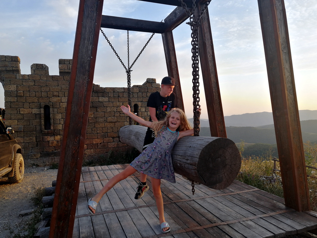 Выбравшись на хребет, взору открылись сумасшедшие виды: бескрайнее море с ожидающими чего-то танкерами, ухоженные виноградники и уходящие в горизонт горы. Места здесь по-настоящему кинематографичные. Одна из самых известных картин, снятых в окрестностях Геленджика — «Грозовые ворота». По окончанию работы киношники оставили в горах декорацию — небольшую полуразрушенную крепость, построенную специально для фильма.