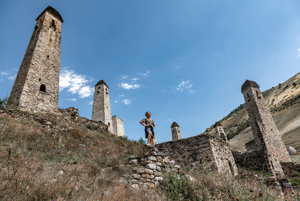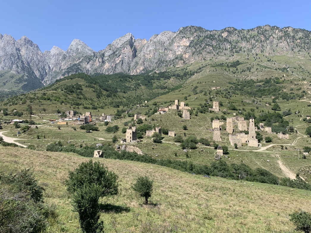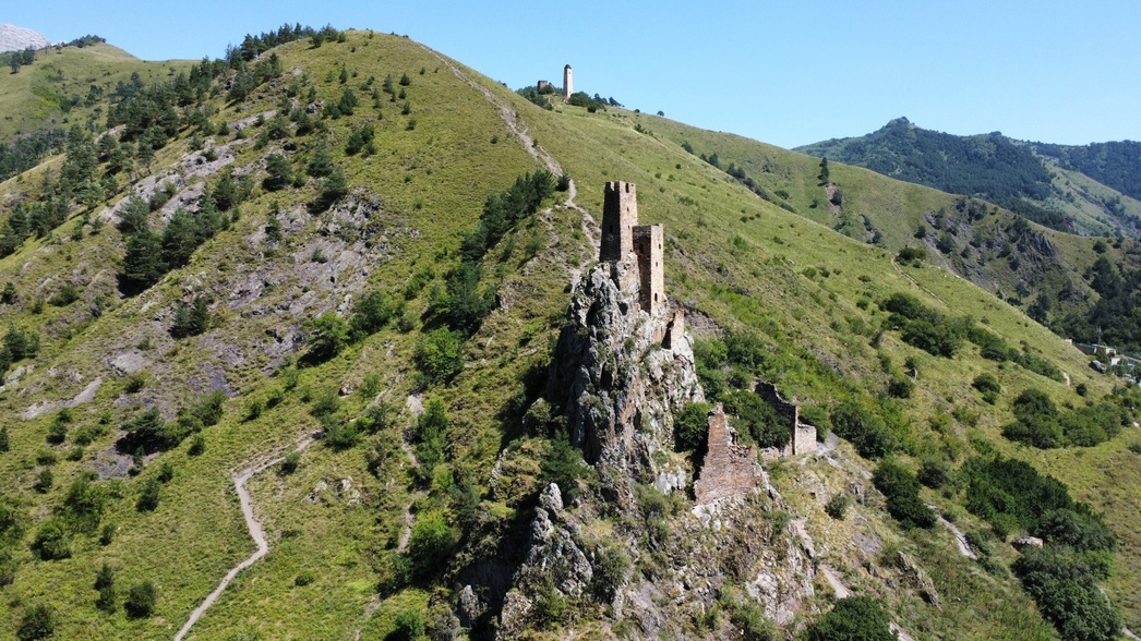 Первая правильная локация расположена неподалеку от въезда в республику со стороны Военно-Грузинской дороги в селе Ольгети — башенный комплекс Эрзи. Тридцатиметровые вайнахские боевые башни впечатляют своей величественностью и монументальностью. Считается, что их постройкой занимался вайнахский зодчий Янд из тейпа Яндиевых, живший в 17 веке. Со временем башни пришли в упадок и были разрушены. Сегодня можно лицезреть их в восстановленном виде. Но это, поверьте, не отменяет всей красоты этого места.