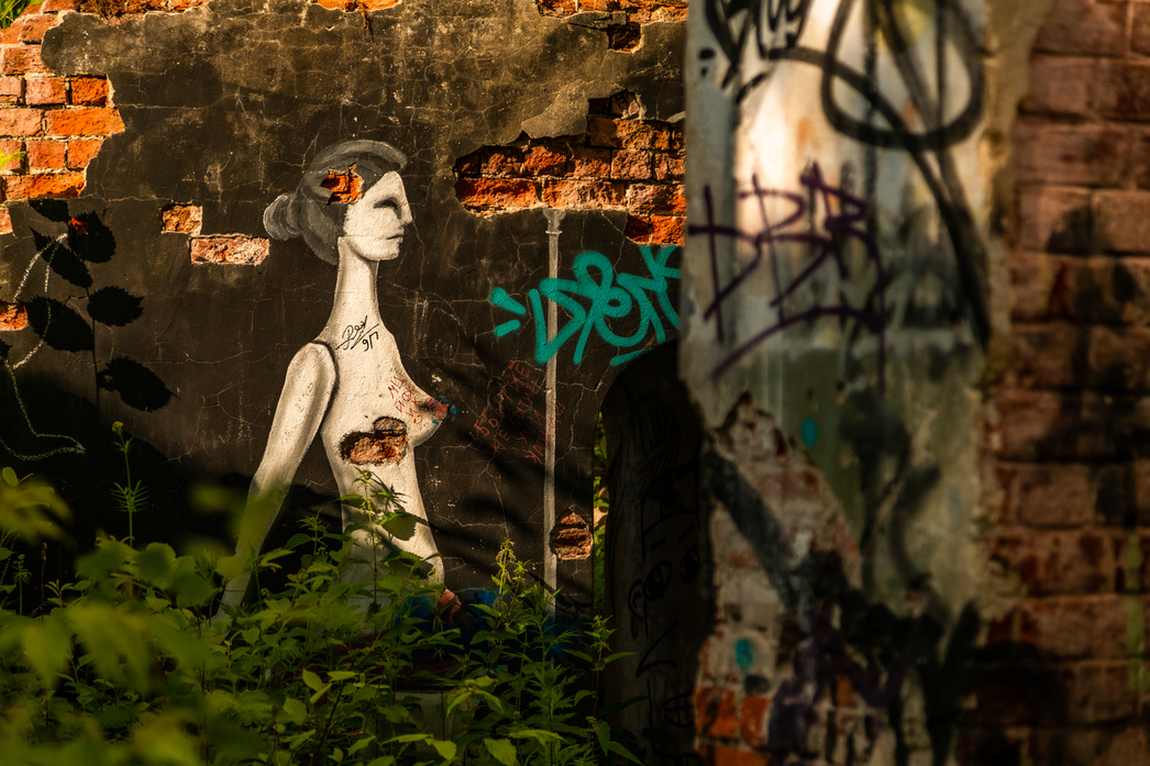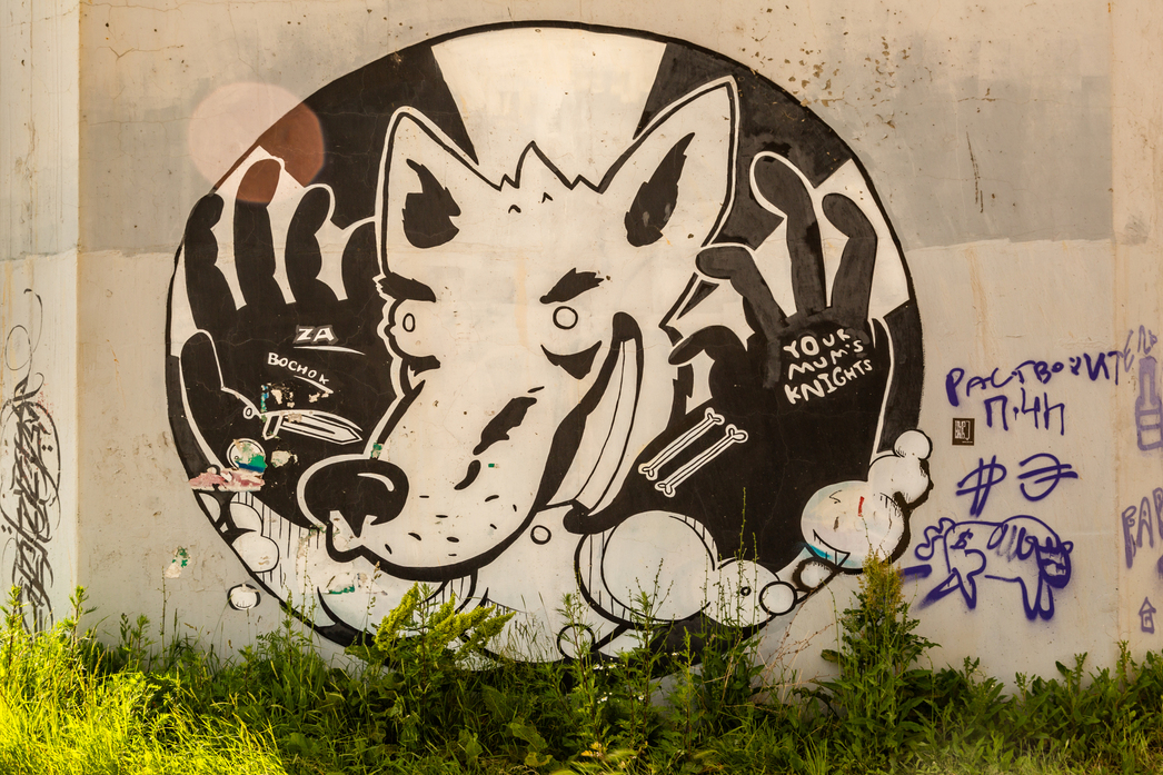 Далее начинаем возвращаться к метромосту, по дороге разглядывая работу Ивана Серого и Егора Той. Сам метромост, вернее, его основание — одно из наиболее известных «собраний» городского граффити: от каллиграфии до итерации наказания для тех, кто спит на краю. Отдельное внимание — Алексею LexuOne и его «Гуляй, дядя». Очень!