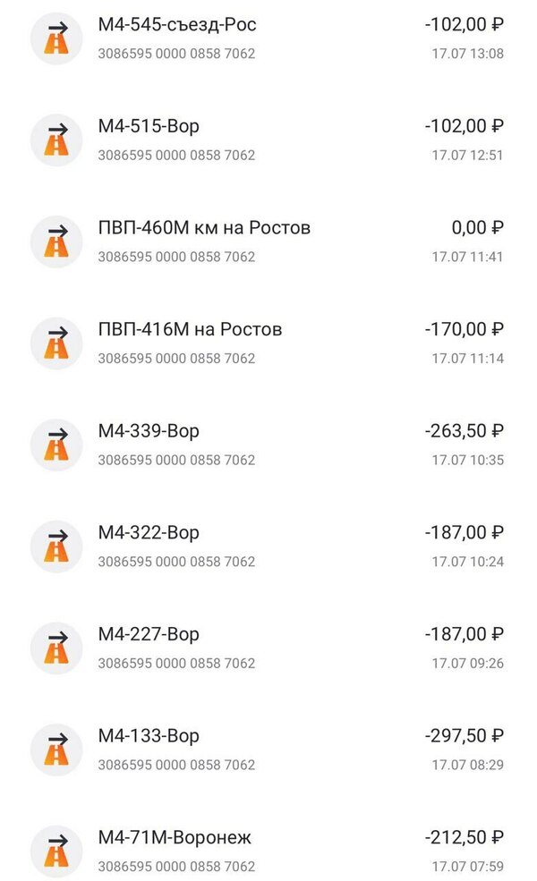 Теперь о тратах на платные участки. На первый мы заехали в 7-59 утра, последний проехали в 2-17. Всего их, согласно приложению, восемнадцать штук. Напомним, что оплачивали их с помощью транспондера, а скидку приобрели заранее. Итого имеем 3612,5 рублей.