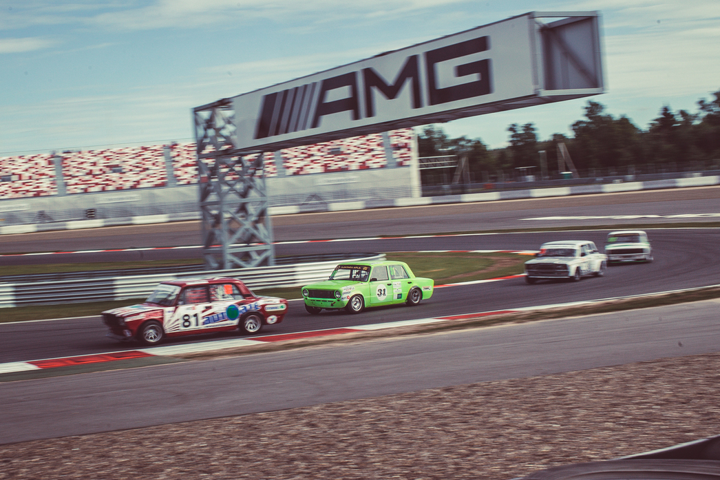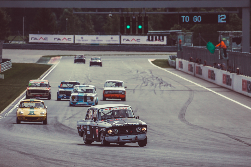 Столь жесткий подход к безопасности, пусть речь идет о заездах ретромобилей, более, чем оправдан: с гонками с общим стартом не шутят. А именно эта часть соревнований (заезды «Спорт») стала особенно зрелищной. Здесь было предусмотрено несколько зачетов, разбитых на первом этапе на пять основных групп: «Волга», «Жигули-1300», «Жигули-1600», «Москвич-1600» и «Москвич-2000». Свободные классы «Москвич+» и «Жигули+» остались малочисленными, и ни один из заявленных автомобилей не добрался до финиша. Кстати сказать, состязание вышло вполне международным: в нем, кроме гонщиков из России, приняли участие представители 4-х некогда советских республик – Белоруссии, Литвы, Латвии и Грузии. Им предстояло преодолеть 15 кругов по конфигурации Sprint, то есть в общей сложности чуть больше 30 км.