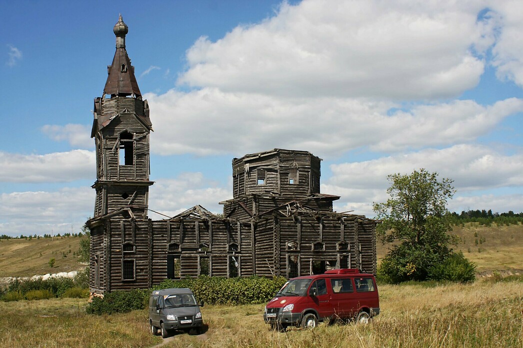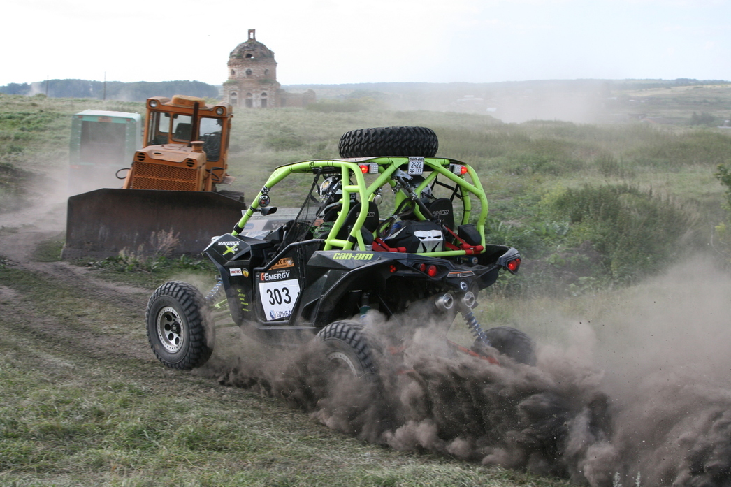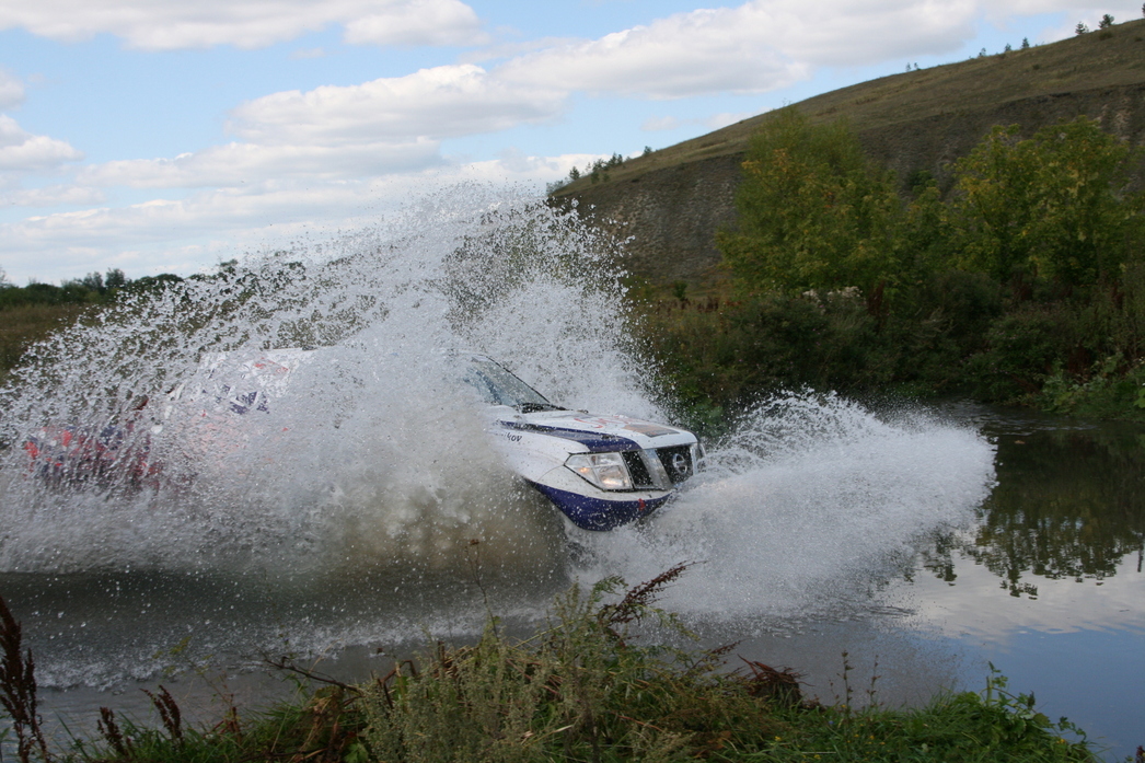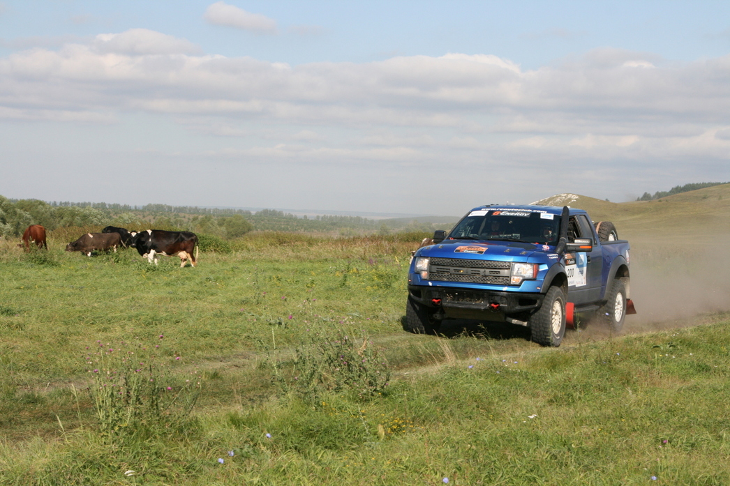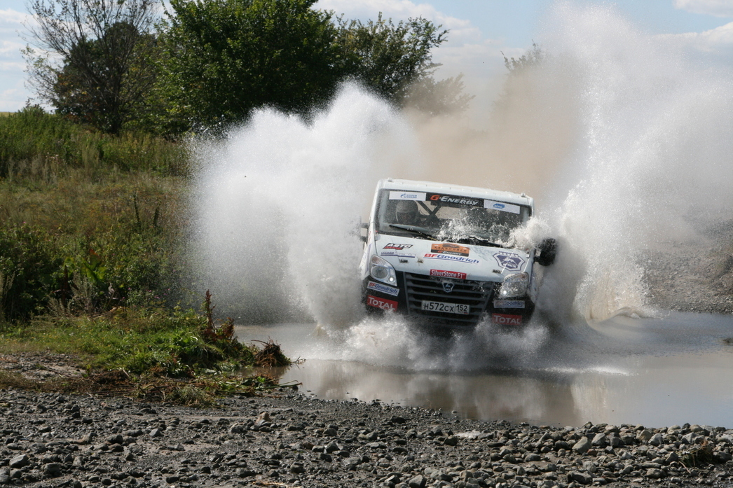 Настолько неприятных, что гонщикам не пришлось любоваться пасторальными пейзажами. Да и журналистам это удалось сделать по минимуму – с виду «утоптанная» грунтовка готовила командам всевозможные сюрпризы. Например, узкие дорожки на лесных участках, неожиданные ямы по краям, а то и посередине дороги. Если водитель пресс–кара на скорости 40-60 км их еще может заметить, то гонщик на «сотне» – вряд ли. Остается надеяться только на своевременные команды штурмана. Мало того, зачастую дорожные изъяны были тщательно замаскированы травой и кустарником, но обозначались в роудбуке, как «яма 2». Плюс к этому более банальные сюрпризы: неожиданные спуски, подъемы и резкие повороты. Кстати, на одном из них коварными организаторами был установлен бульдозер, а слева от него проходил пересохший оросительный канал. Для мотоциклистов этот узкий коридорчик не стал препятствием, а вот для несущегося на полной скорости гоночного грузовика... Для полного антуража, напротив бульдозера живописно «расположили» развалины церкви. Мы не удержались, и сфотографировали наш полноприводный «Соболь» на фоне одной из них. На маршруте гонок находилось и несколько бродов, которые так же дарили любопытные кадры. Особенно, когда их проходил гоночный грузовик. Здесь поневоле понимаешь, почему ульяновская трасса, наряду с Калмыкией и Астраханской областью, прочно обосновалась в календаре российских ралли-рейдов.