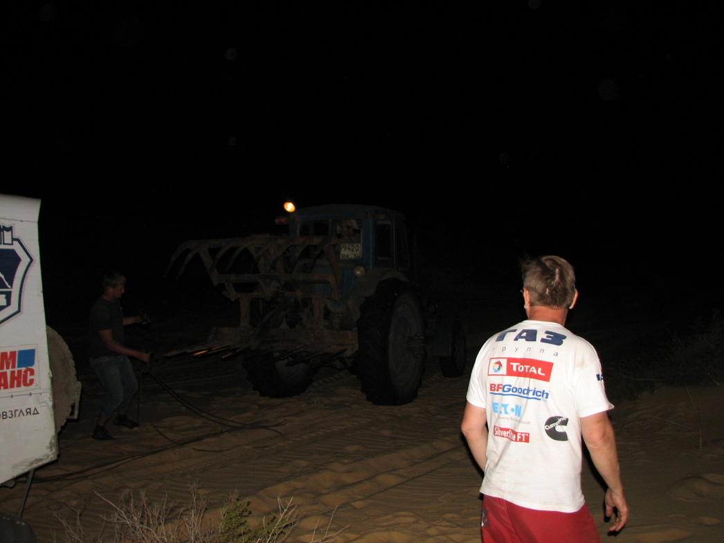 Тем временем выяснилось, что поблизости рыщет трактор местных жителей, который уже вытащил застрявший неподалеку другой экипаж. Связываемся с трактористом и появляется надежда, что у нас есть шанс сегодня добраться до цивилизации: пришедшие на помощь суфии должны разместиться в импровизированном «кузове» гоночного «Соболя» среди агрегатов, пока трактор вытягивает нас до асфальта.