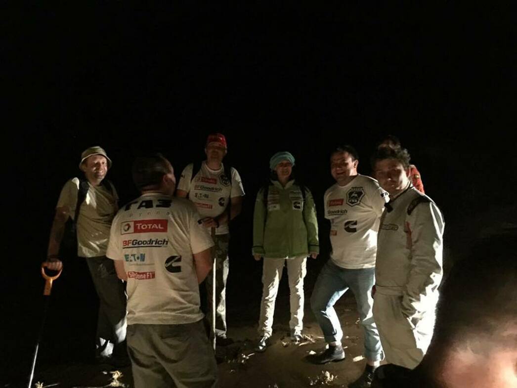 Тут на нас находит первое откровение: в отличие от технарей-гонщиков, гуманитарии-журналисты люди творческие и постоянно что-то забывают. Например о том, что в машине всегда должен быть не только комплект инструментов, но и компрессор, сенд-траки и множество других внедорожных аксессуаров. Или пустынные духи мешают быть собранными? На этот раз внедорожное снаряжение мы забыли и пришли к выводу, что даже на приспущенных колесах до застрявшего экипажа не доберемся, сами засядем. Да и накачать колеса будет негде. Так что наша команда разделилась: одни остались в машине, а другие потащились по барханам с запчастями и запасом воды. В качестве навигатора – обычный телефон, по которому мы получили координаты застрявшего экипажа. Только телефон у пишущей и снимающей интеллигенции садится, его пришлось выключить и идти по солнышку. Слава Богу, что творческие люди когда-то служили в армии и ориентироваться в полевых условиях не разучились, несмотря на это самое творчество.