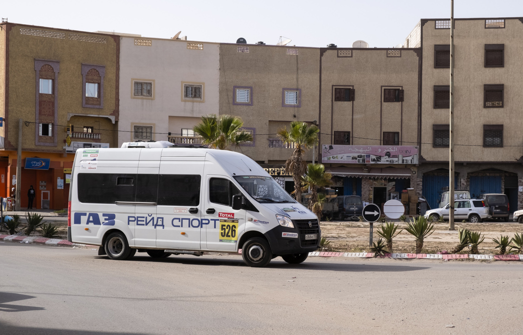 Пятый день соревнований проходил по Сахаре. Но великая пустыня здесь не похожа на картинку, нарисованную в моем мозгу еще в детстве: море барханов из песка. Нет, Западная Сахара напоминает казахскую степь — со слабой порослью зелени, которую флегматично жуют верблюды. Если летом здесь печет не по-детски, то зимой климат вполне комфортный: 20—25 градусов днем и около нуля ночью. В группу сопровождения команды «ГАЗ Рейд Спорт» входит Начальник управления продуктового планирования автозавода ГАЗ Олег Медведев. Возник законный вопрос, зачем здесь глотает сахарскую пыль человек, который отвечает за развитие продуктовой линейки: