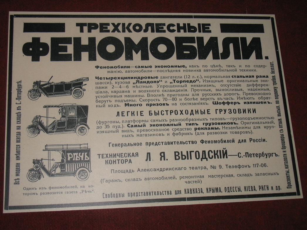 И вновь речь пойдет о трехколеске. На сей раз под названием Phanomobil 4/9PS. Мотоциклом назвать «это» уже не хочется. Данная конструкция удивляет своей компоновкой. Двухцилиндровый двигатель мощностью 6 л. с. смонтирован прямо на вилке переднего рулевого колеса. Наверняка поворачивать его при маневрировании тяжеловато — при такой-то дополнительной массе! Однако конструкторов выручил старый проверенный вариант: по традиции, свойственной всем ранним «бензиномоторам», они вместо рулевой «баранки» снабдили Phanomobil простым длинным рычагом, — эх, пассажир на переднем сидении, поберегись: поворачиваю! Хотя странная конструкция вполне могла разгоняться до 50−60 км/час, а рекламные объявления расхваливали данные автомобили, как «самые экономные по цене и содержанию», однако большого спроса на них среди российских автомобилистов достичь так и не удалось.