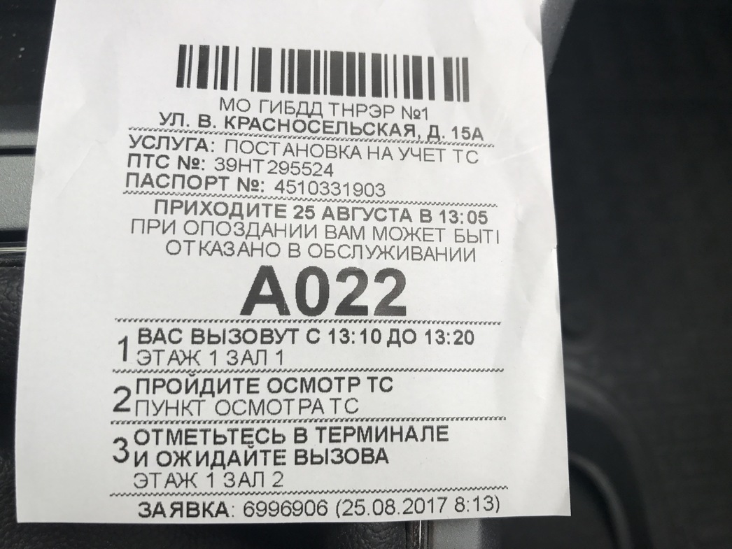Для тех кто еще не знает или забыл скажем, что постановка т/с на учет делится на три, нет — четыре этапа. Сначала нужно записаться на получение услуги (через gosuslugi.ru или при личном, как в нашем случае, визите в подразделение). Затем с помощью оператора оформить заявление. С которым — третье действие — отправиться на площадку техосмотра. И, наконец, подать все документы для окончательной регистрации (получение госномеров и Свидетельства о регистрации ТС для свежекупленной машины, и просто новый СТС — для старой).