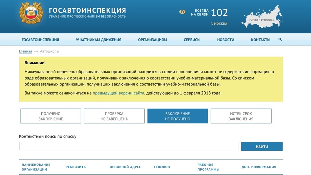 Напомним, что любой гражданин, собирающийся пойти учиться на «права», должен иметь возможность получить на сайте ГАИ информацию о том, какие образовательные организации работают легально, а не по серым схемам — то есть, в том числе, получили от автоинспекции заключение о соответствии своей учебно-материальной базы российскому законодательству, а значит и имею соответствующую аккредитацию. И это очень важные сведения, потому как отучившись в несертифицированной школе, легко остаться и без денег, и без «прав». Но что же видит человек, попавший на новую версию сайта?