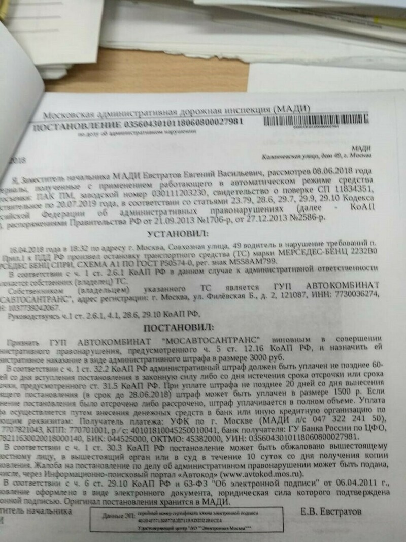 А вот и нет, как выясняется! Через некоторое время в адрес ГУП пришло «письмо счастья», где черным по белому был прописан штраф в соответствии с частью 5 статьи 12.16 КоАП — «несоблюдение требований, предписанных дорожными знаками или разметкой проезжей части дороги, запрещающими остановку или стоянку транспортных средств». Санкция — 3000 рублей.