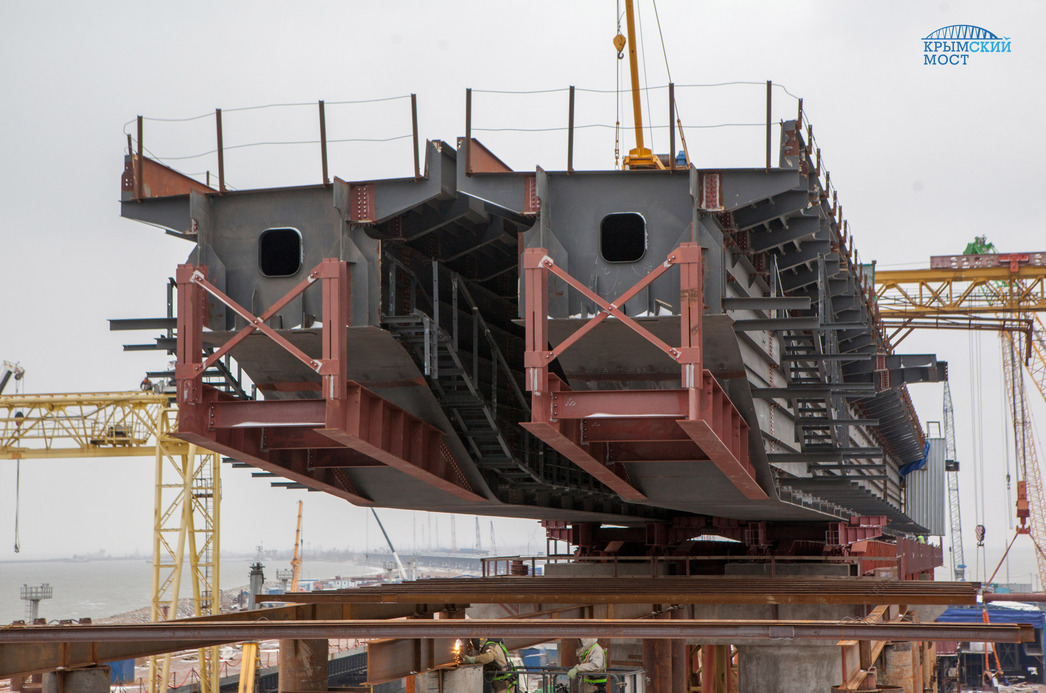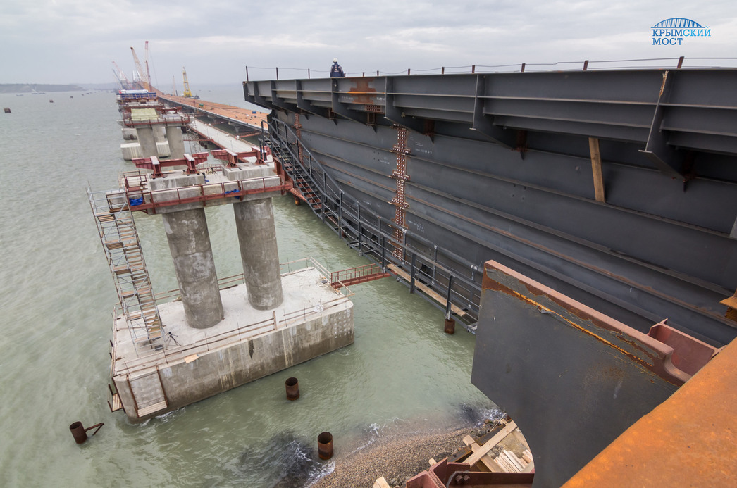 По словам представителей компании, в нынешнем году работу по сооружению пролетов железной дороги начнут на всех морских участках Крымского моста. Над Керченским проливом на 64 опорах возведут более шести километров металлоконструкций.