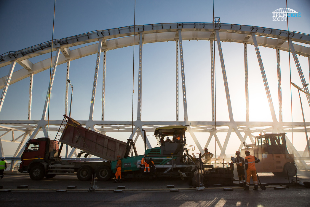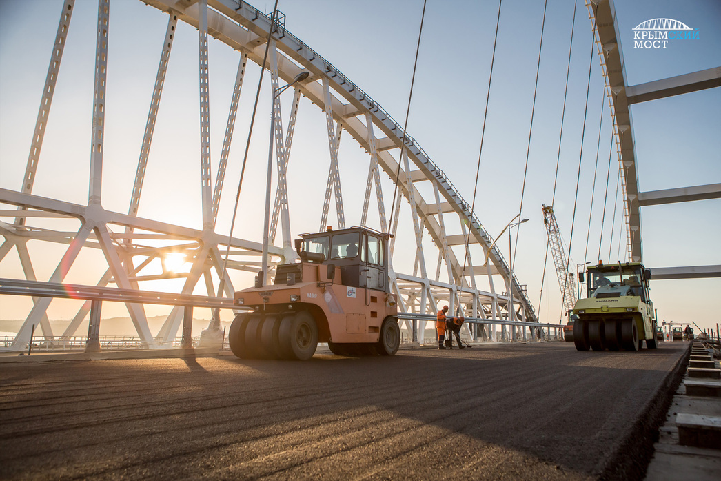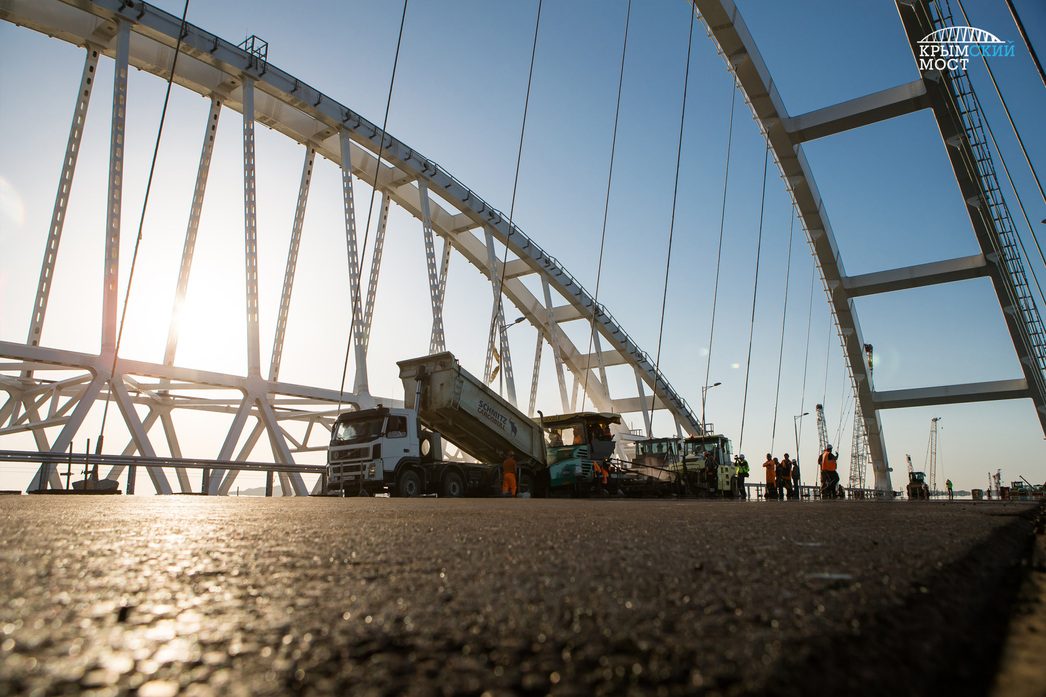 В целом же, подчеркивают строители, на сегодняшний момент заасфальтировано примерно 75% трассы Крымского моста, а общая готовность полотна, включая дорожную одежду, деформационные швы и элементы обустройства, достигает 80%. Что же касается арочного пролета, то здесь площадь асфальтирования относительно небольшая — около 4,5 тысяч квадратных метров. Напомним, что дорожное покрытие Крымского моста двухслойное общей толщиной 11 см. Правда, в случае с аркой до укладки асфальта на специально обработанную металлическую поверхность пролета был нанесен слой гидроизоляции.