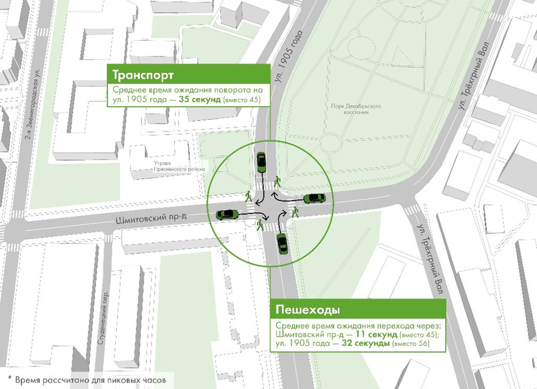 В качестве пробных правительство города выбрало три перекрестка: пересечение Шмитовского проезда с улицей 1905 года, Волкова переулка с Красной Пресней, а также улицы Старая Басманная с Токмаковым переулком. Согласно предварительным подсчетам, в результате перенастройки светофоров время ожидания перехода для пешеходов на Шмитовском сократится в 4 раза, на улице 1905 года и Старой Басманной — вдвое, а на Волковом переулке — аж в 11 раз.