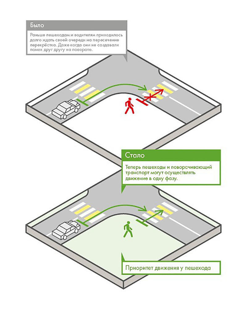 Суть нововведения в том, что отныне зеленый сигнал для водителей, совершающих поворот направо, и прохожих, находящихся как раз за этим «углом», будет включаться практически одновременно. Как следствие — участникам дорожного движения больше не придется подолгу ждать свой «очереди». По крайней мере, так нам обещают.