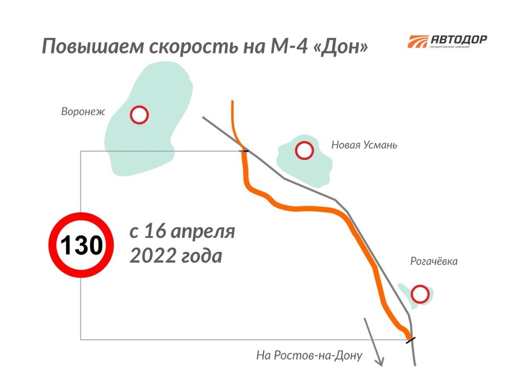 Кроме того, с 16 апреля повышенный скоростной режим вводится на участке с 517-го по 544-й километр трассы М4 «Дон» в обход Новой Усмани и Рогачевки в Воронежской области. Разрешенная скорость здесь также вырастет со 110 до 130 км/ч.
