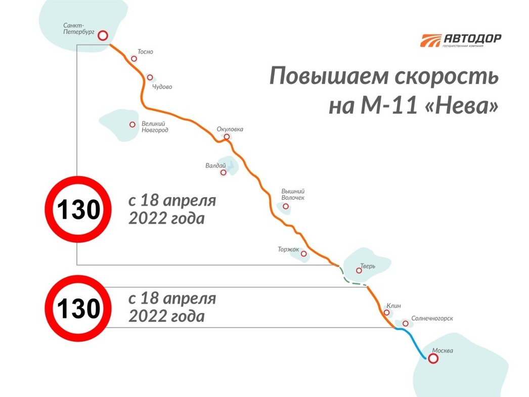 С ноября прошлого года на трассе М11 максимальная разрешенная скорость составляла 110 км/ч, чтобы обеспечить безопасность автомобилистов в зимний период. С 18 апреля «Неву» от 59-го километра в Московской области до Санкт-Петербурга «разгонят» до 130.