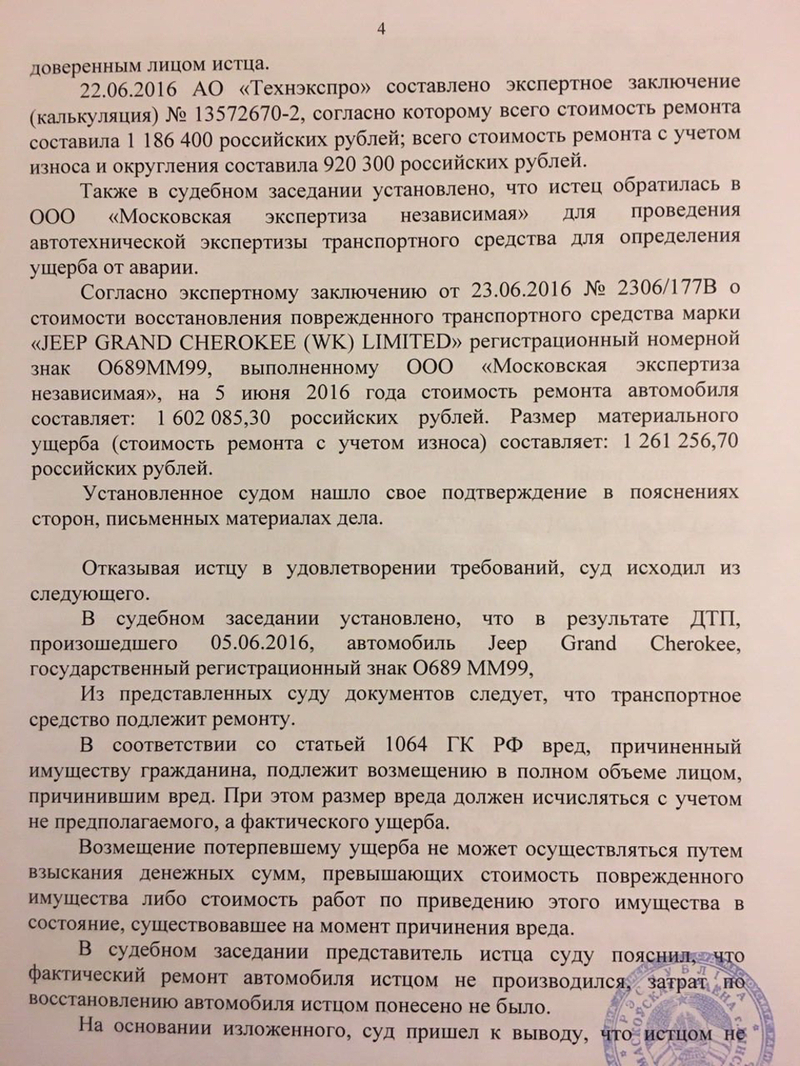 Эксперт страховой компании насчитал по ОСАГО повреждений более чем 1 млн. рублей. Затем, благодаря жульническому по своей сути приколу отечественных страховщиков под названием «износ», сумма ущерба волшебным образом уменьшилась до 828 000 рублей. Независимая автоэкспертиза (была проведена и она) насчитала порядка 1,6 млн. рублей за восстановление авто, и даже с учетом того износа — не менее 1,2 млн. рублей. Но это обстоятельство оказалось, в принципе, не особо важно, поскольку максимально возможная выплата по материальному ущербу в рамках ОСАГО составляет 400 000 рублей. Эти деньги владельцу злосчастного Cherokee аккуратно выплатили. Оставшиеся средства российское законодательство предлагает взыскивать через суд по месту регистрации или нахождения ответчика. То есть в белорусском суде, в городе Минске.