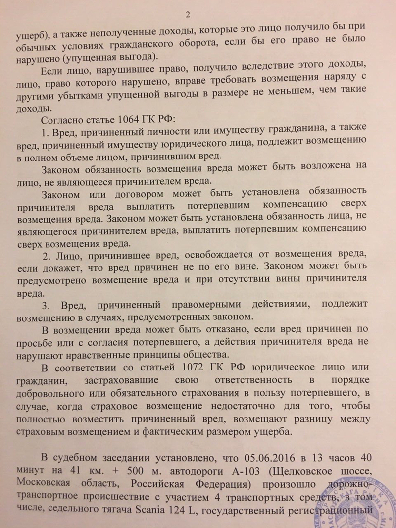 Авария, финансовые последствия которой многодетная семья из Москвы расхлебывает до сих пор, случилась еще прошлым летом. Пятого июня 2016 года на 41 километре Щелковского шоссе дальнобойная фура с тягачом Scania с белорусскими номерами врезалась в Jeep Grand Cherokee под управлением Елены Олейниковой. К счастью, большегруз, принадлежащий ООО «Белтрансвейс», имел оформленную «зеленую карту», что дало право на денежное возмещение в рамках ОСАГО. Но и только. Как положено, вызвали ГИБДД, оформили аварию, в которой признали виновным белоруса. А дальше начались «приключения» с возмещением ущерба.