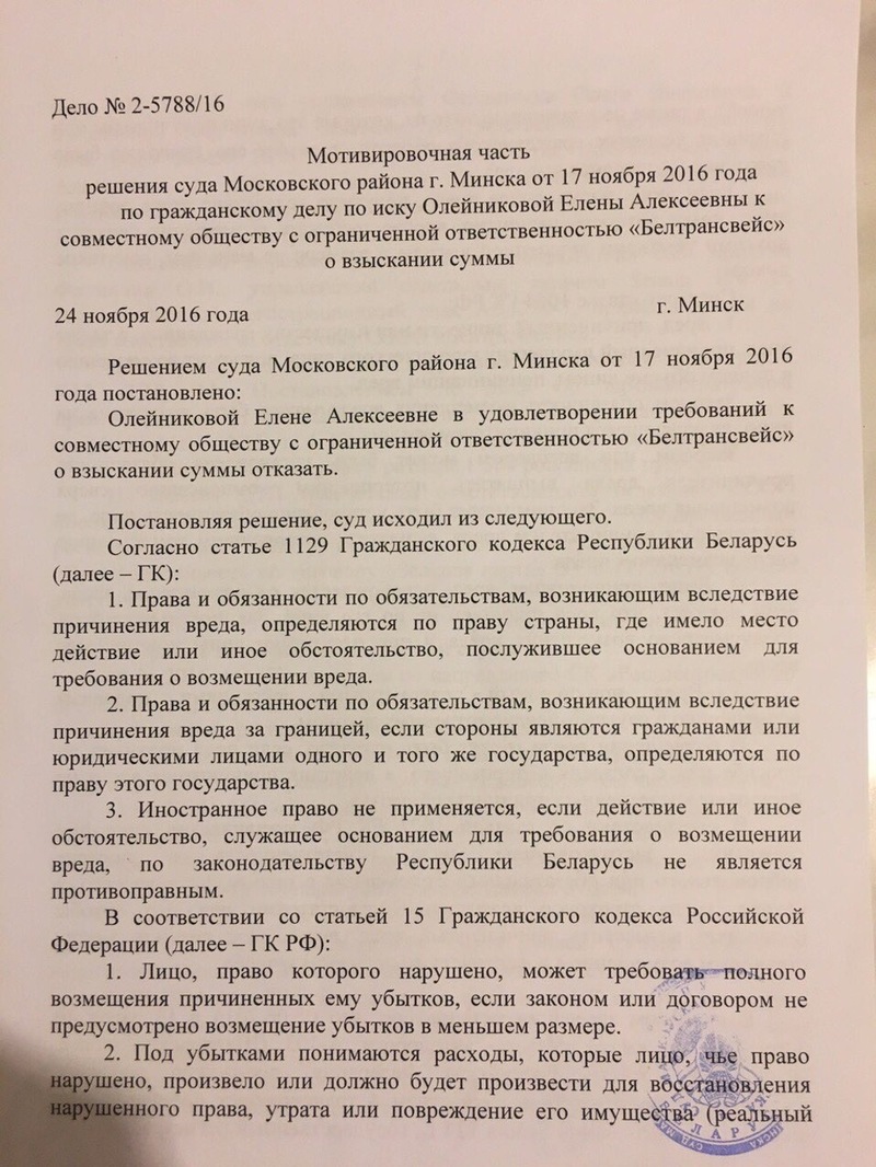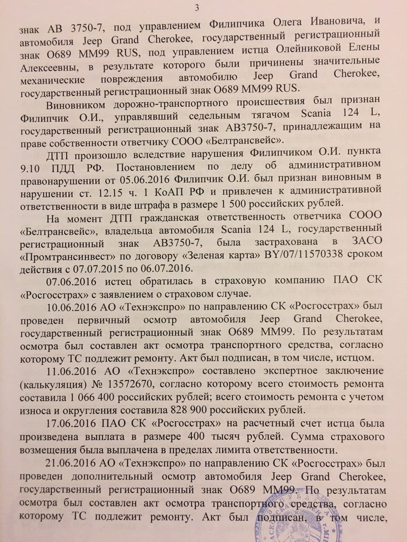 Туда и отправилась водительница разбитого «джипа» в августе 2016-го, чтобы отсудить 840 000 рублей — разницу между независимой оценкой повреждений и фактически выплаченной в рамках ОСАГО суммой. Помимо затрат на проживание и услуги местного адвоката, пришлось внести в белорусскую казну 5% от суммы иска. Слушание дела состоялось 17 ноября 2016. Результатом стал полный отказ в удовлетворении требований российского автовладельца, поскольку экспертиза, как решило белорусское правосудие, насчитала «предполагаемый», а не реальный ущерб. И, по мнению судьи, взыскание рассчитанной экспертами суммы с ООО «Белтрансвейс» может привести к незаконному обогащению Олейниковой Е.