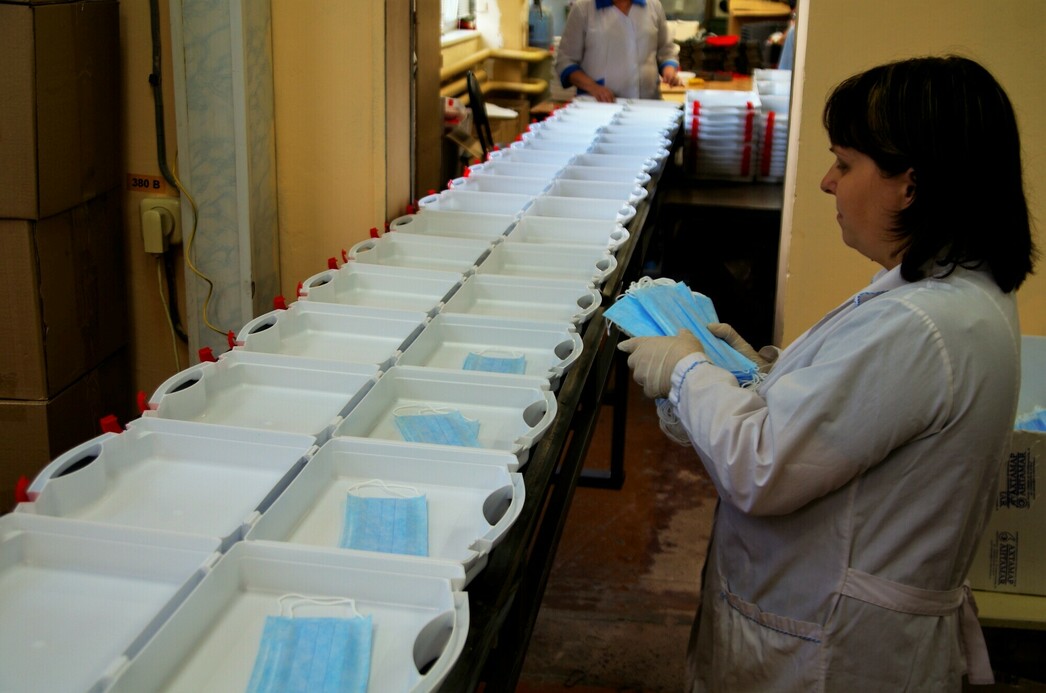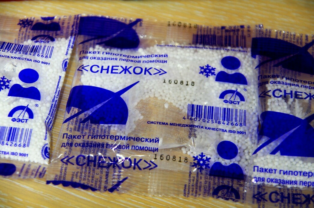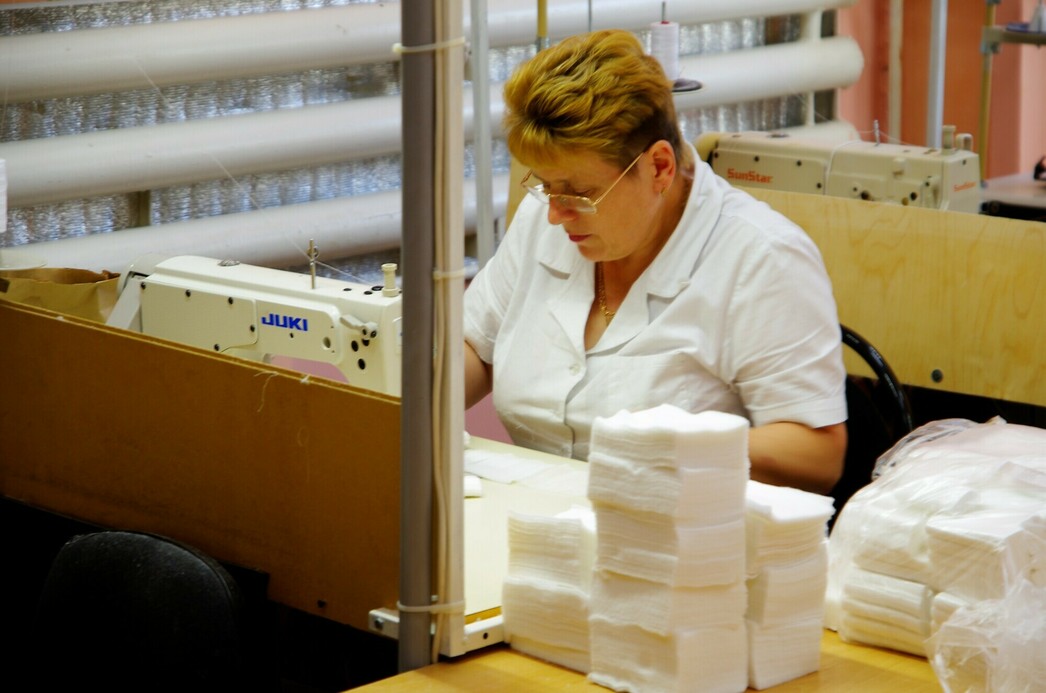 Так что же из состава аптечек производят непосредственно на ФЭСТ? Немало! Например, гипотермические пакеты с гранулами, или перевязочные, которые делаются практически вручную. Цех напоминает большое ателье индпошива, только с материалами исключительно белого цвета.