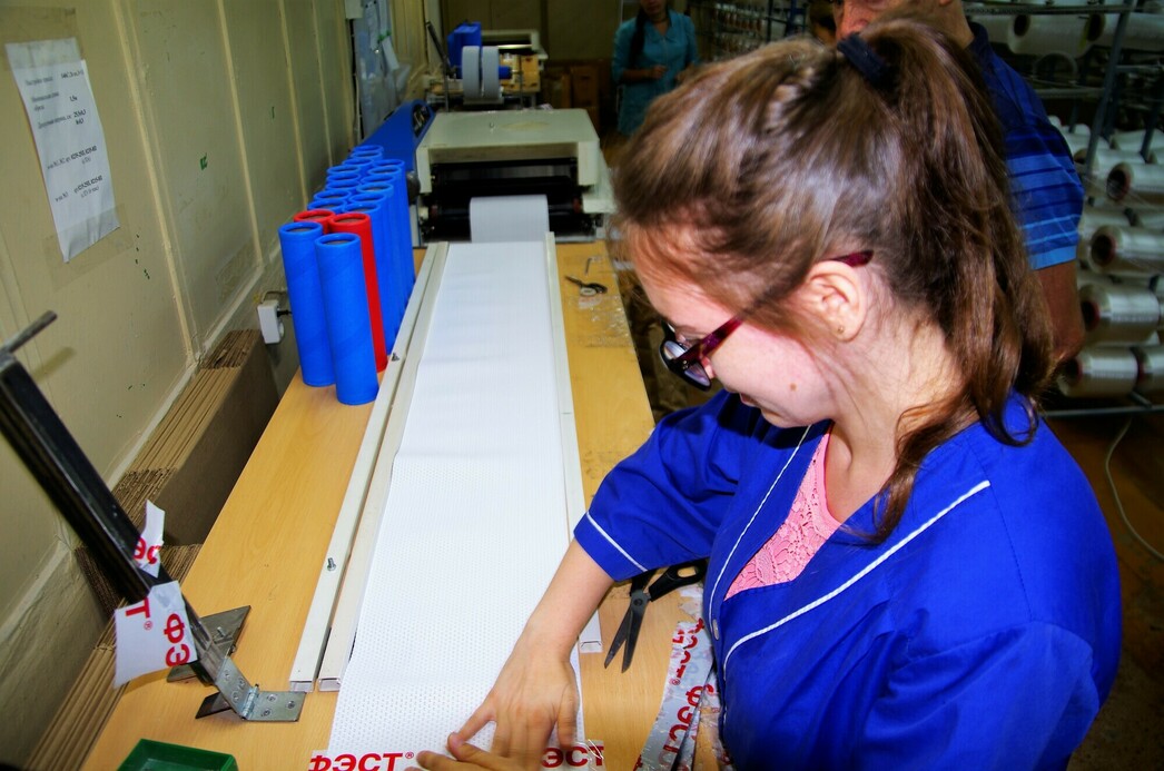 Далее — еще один, ткацкий. Хитроумные станки производят материал для изготовления кровоостанавливающих жгутов. Еще в одном цехе их раскраивают и упаковывают. Все оборудование импортное, по виду вполне современное. Естественно, в цехах идеальная чистота и, что удивительно, относительная тишина.