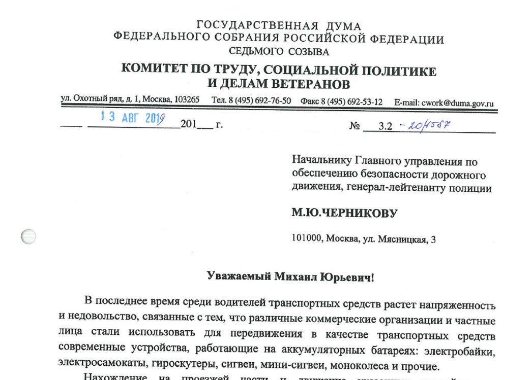 – В случае ДТП с гражданами, использующими транспортные средства, работающие на аккумуляторных батареях, с высокой долей вероятности виновным будет признан водитель автомобиля, а пользователь современного устройства может вообще избежать ответственности. При ДТП с летальным исходом, водитель будет подвергнут наказанию за преступление в соответствии с нормами уголовного права — пишет депутат генералу. — В связи с вышеизложенным, прошу дать поручение изучить складывающуюся практику в целях принятия необходимых решений. Полагаю, что правила использования подобных устройств для передвижения по автодорогам необходимо закрепить в ПДД наряду с такими т/с, как велосипеды, мотороллеры для недопущения аварийных ситуаций…