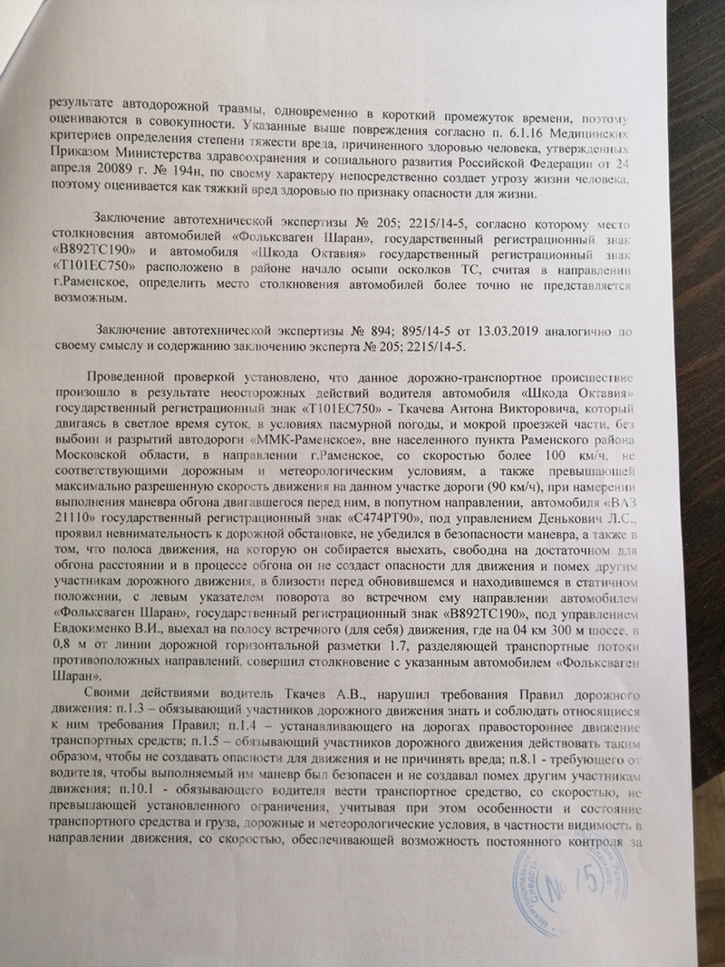 Так, автотехническую экспертизу для установления виновника ДТП назначили на 24 апреля 2018 года. На осмотр машин, по словам дочери пострадавшего, у которого, к слову, сил ни на какие тяжбы уже не осталось, никто не выезжал. Экспертизу провели по фотографиям. И только 23 июля 2018 года потерпевший получил постановление, где говорилось, что Ткачев А. В. нарушил ряд правил ПДД, что привело к ДТП.