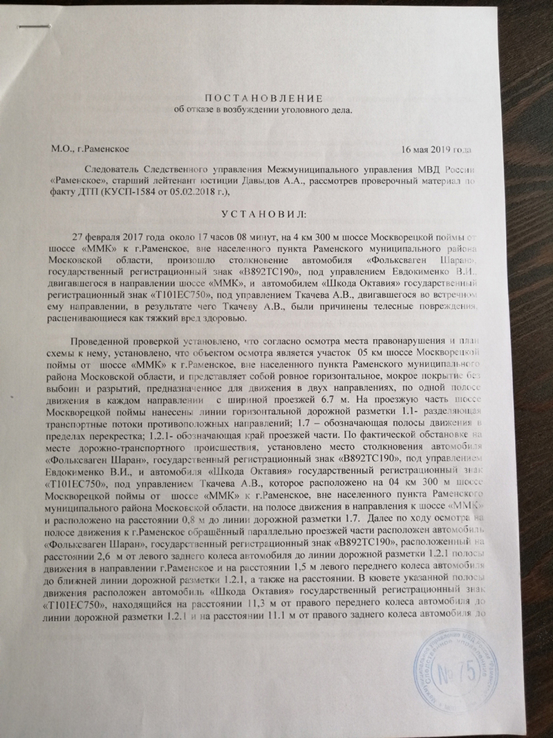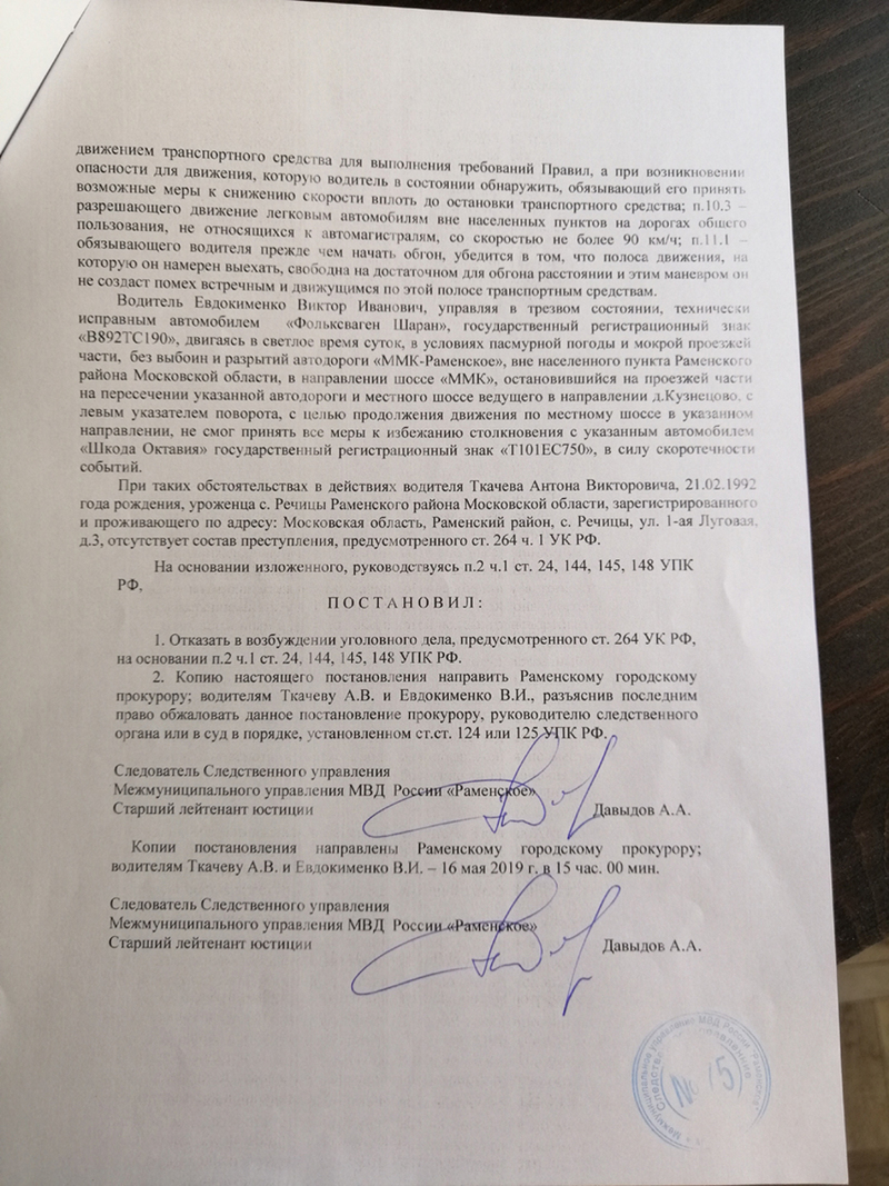 Процесс запустили по второму кругу. Вновь состоялась автотехническая экспертиза. Спустя два года на место аварии выезжали Евдокименко В. И. и Ткачев А. В. с адвокатами, а также свидетель Дьянкович Л. С., который подтвердил свои показания. На свет появилось новое постановление следователя, датированное 16 мая 2019 года. В нем, как и в предыдущем, было указано, что Ткачев нарушил ряд правил ПДД, что привело к ДТП.
