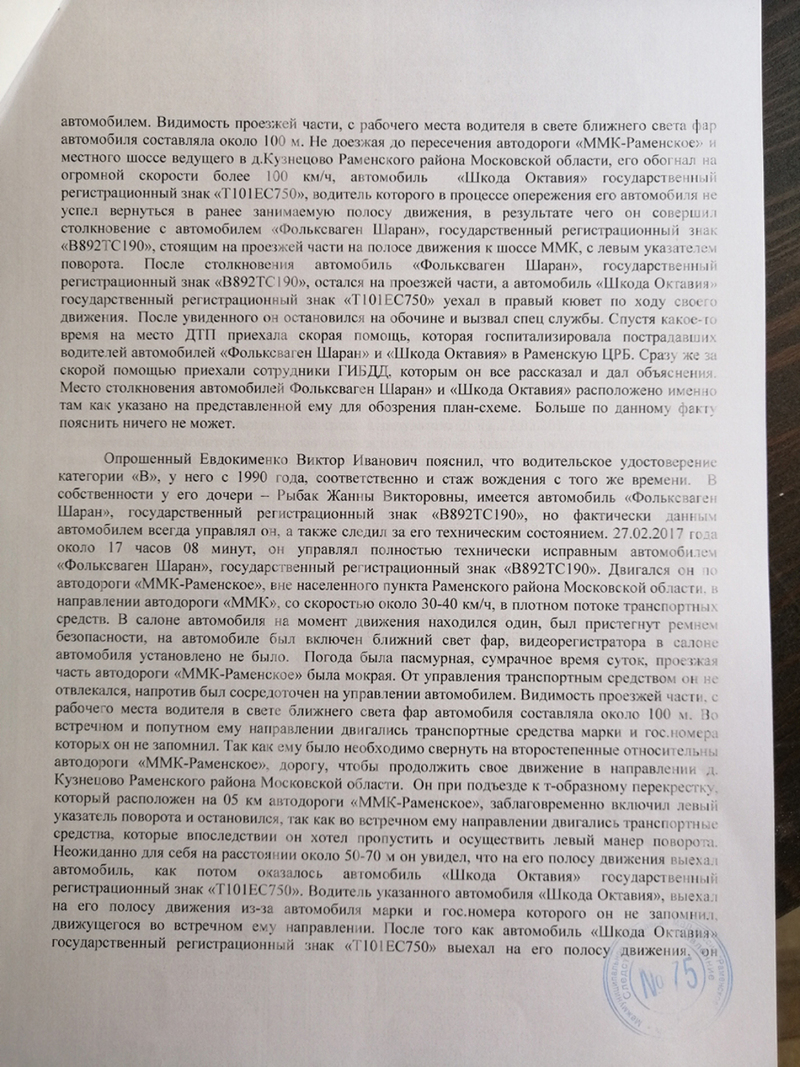 Авария, о которой идет речь, произошла еще в конце февраля 2017-го года на двухполосном шоссе, соединяющем подмосковное Раменское и «малую бетонку» — трассу А107. Тогда старенький VW Sharan пенсионера Виктора Евдокименко мирно стоял, пропуская встречный транспорт, чтобы повернуть влево на прилегающую дорогу. В этот момент ему прямо в лоб «прилетела» Skoda Octavia под управлением Антона Ткачева — молодого человека 1992-го года рождения.