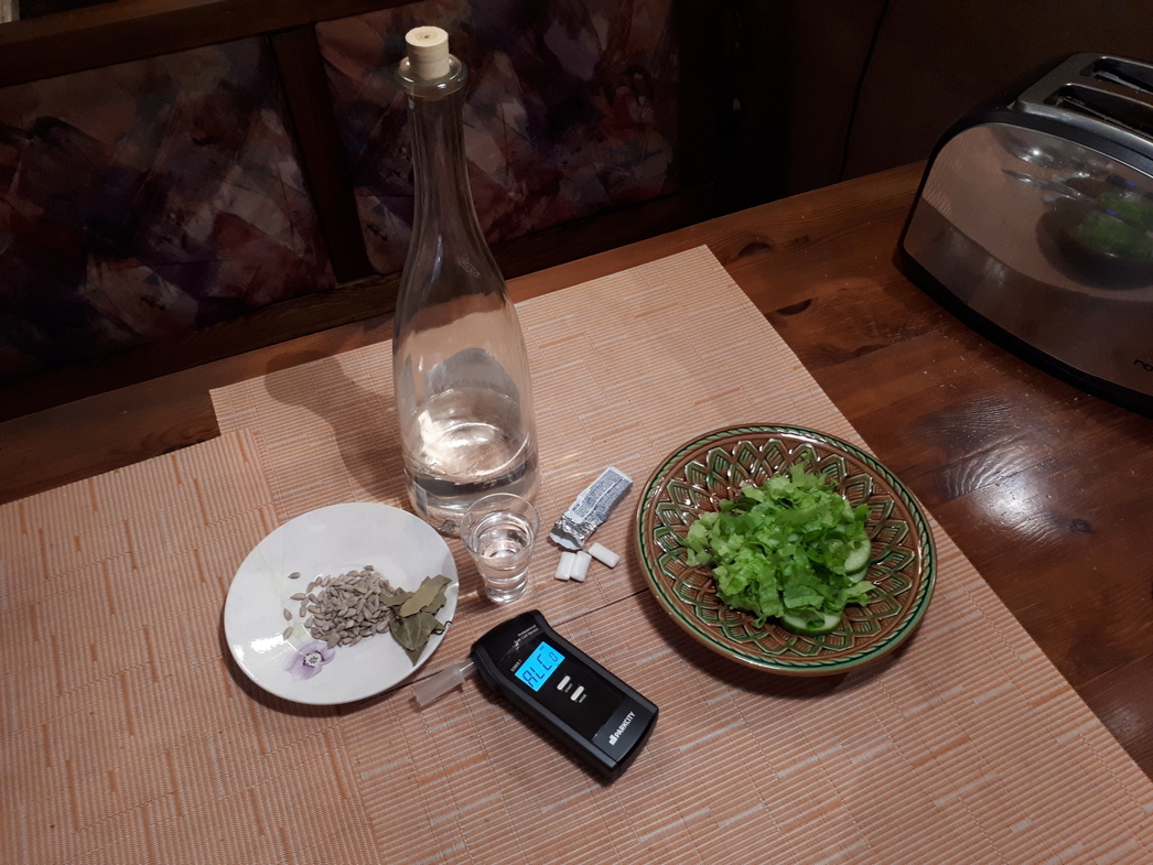 Наш «подопытный» — мужчина средних лет, весом 70 кг. В качестве спиртного, выбрали национальный русский напиток — водку. А чтобы попытаться забить запах алкоголя, взяли уже помянутый лавровый лист, семечки, жевательную резинку и овощной салат. Измерять степень опьянения будем сертифицированным алкотестером.